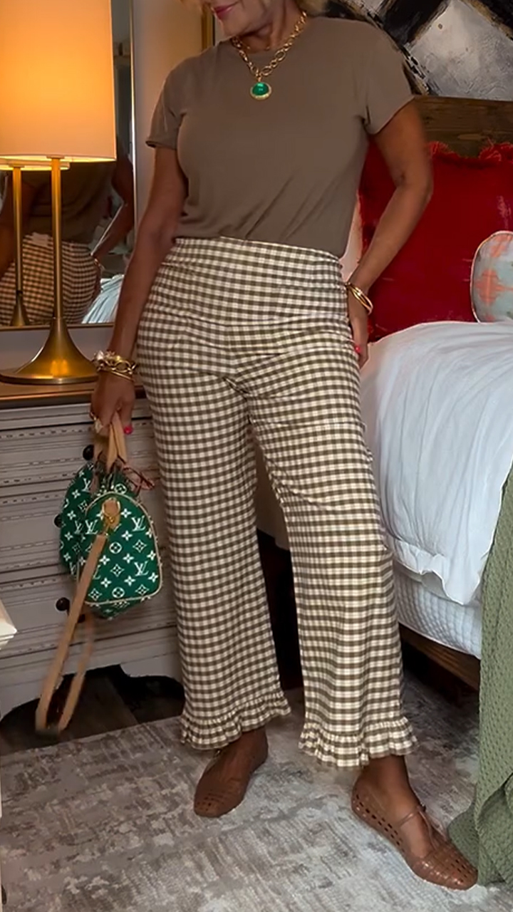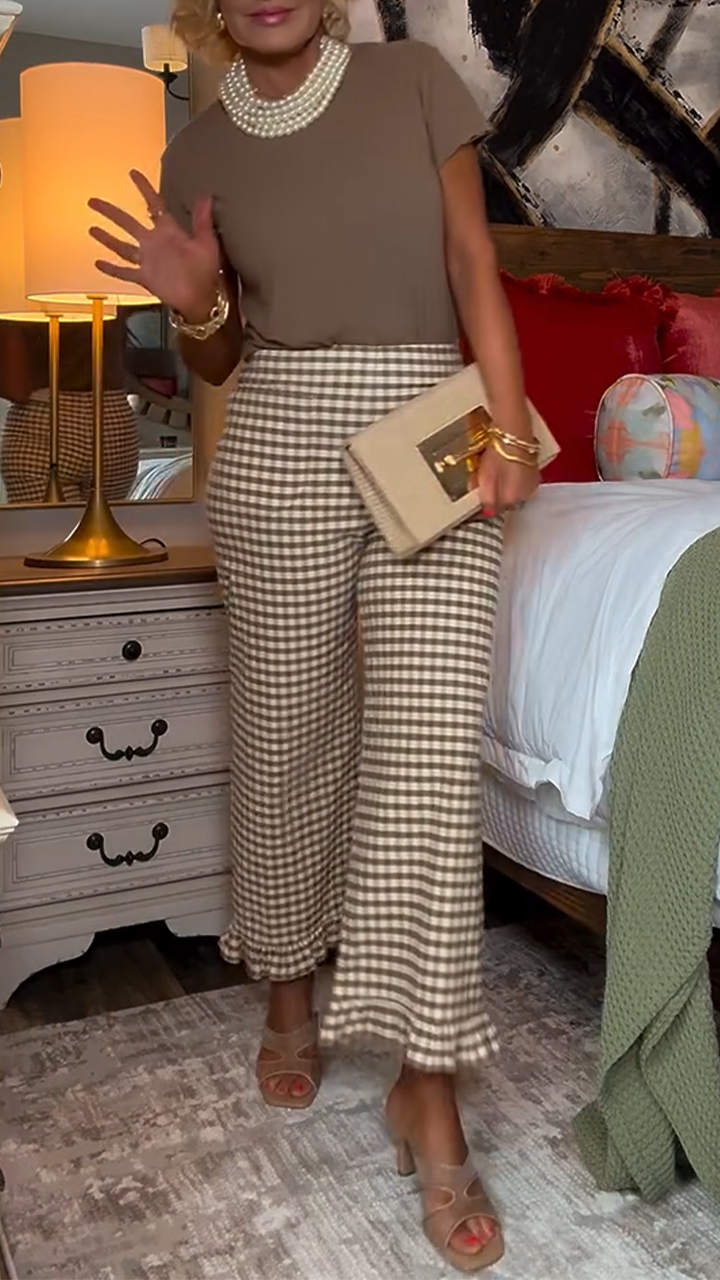 Ladies' Round Neck Solid Color Top+ Plaid Pants Casual Set
