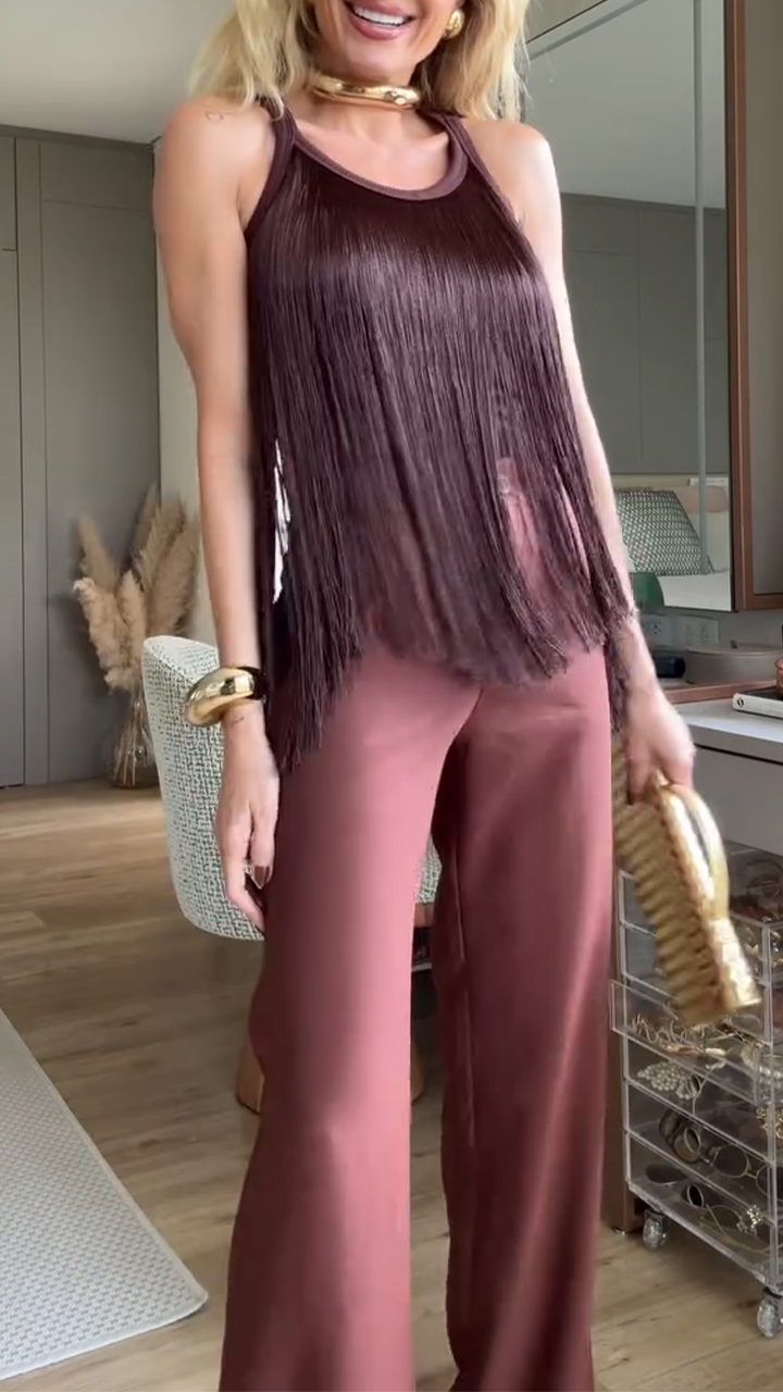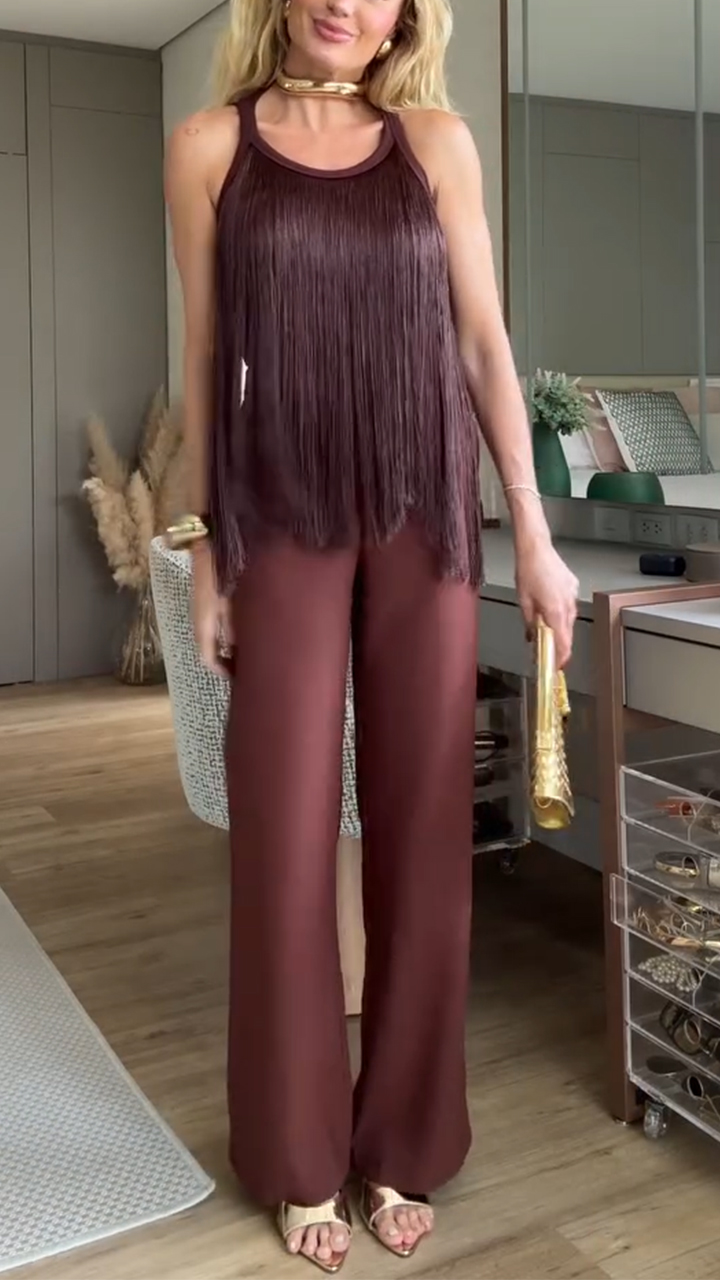 Ladies' Round Neck Hanging Neck Tassel Top and Pants Casual Suit