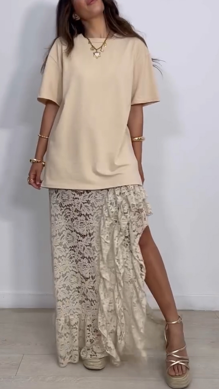 Ladies' Round Neck Solid Color Top+ Printed Hollow Skirt Casual Set