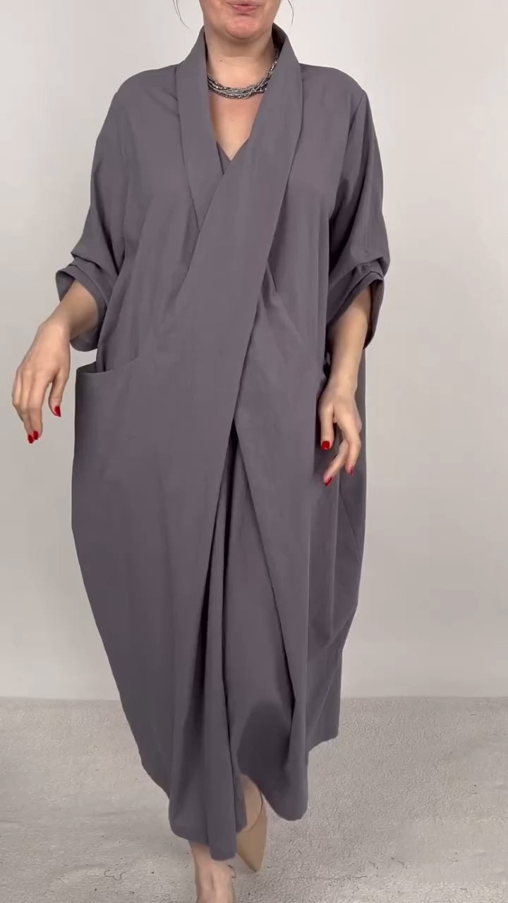 V-neck Cotton and Linen Gray Pocket Design Dress