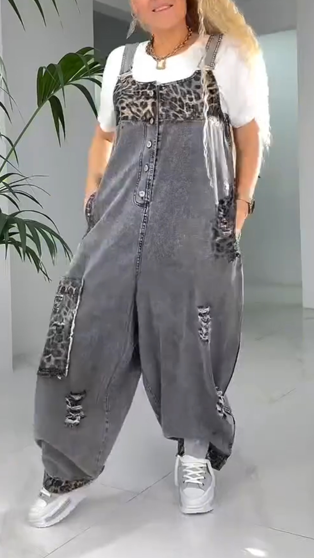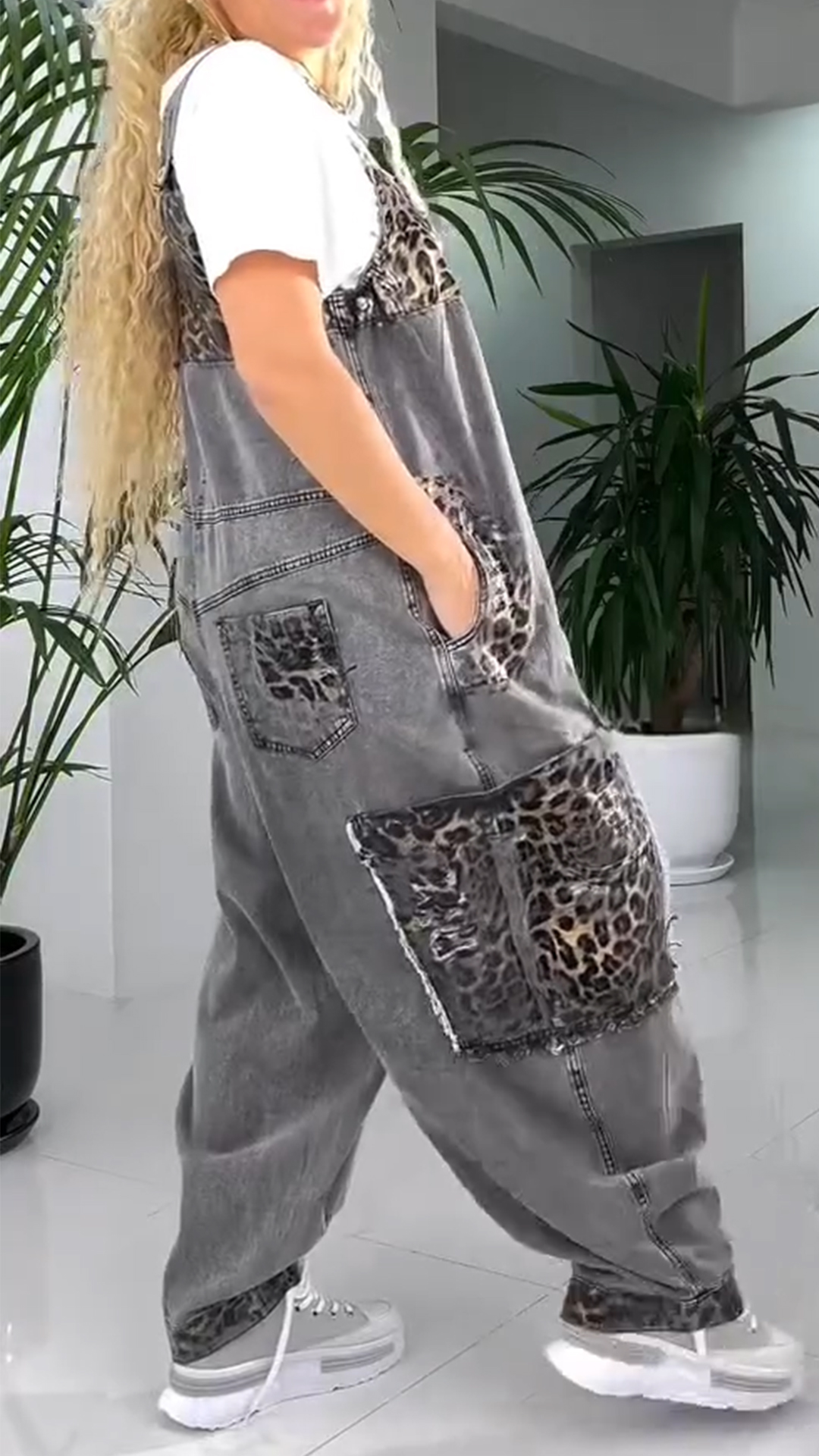 • Ladies' Shoulder Strap Patchwork Leopard Print Casual Jumpsuit