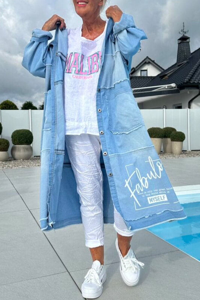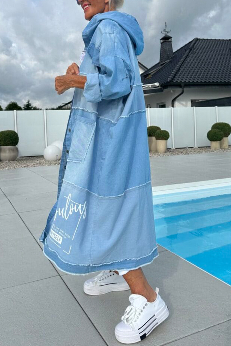 Women's Round Neck Hooded Patchwork Printed Letter Long Cardigan