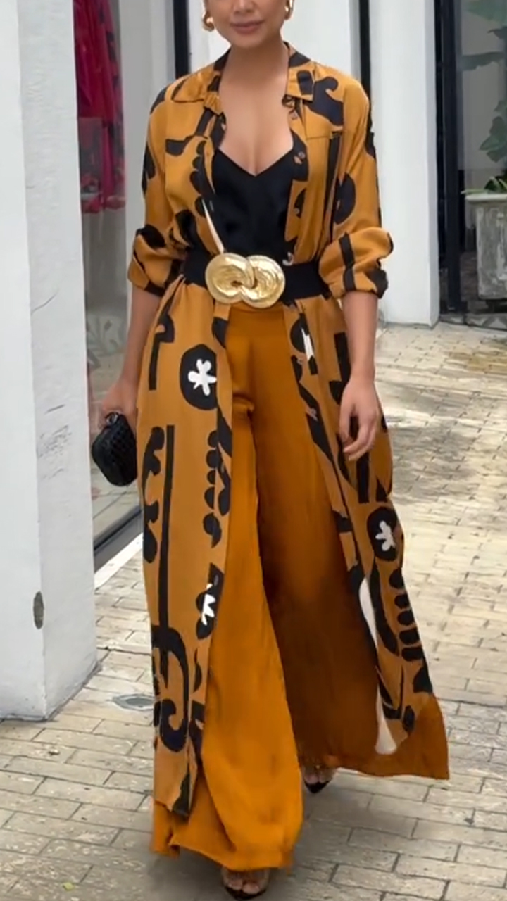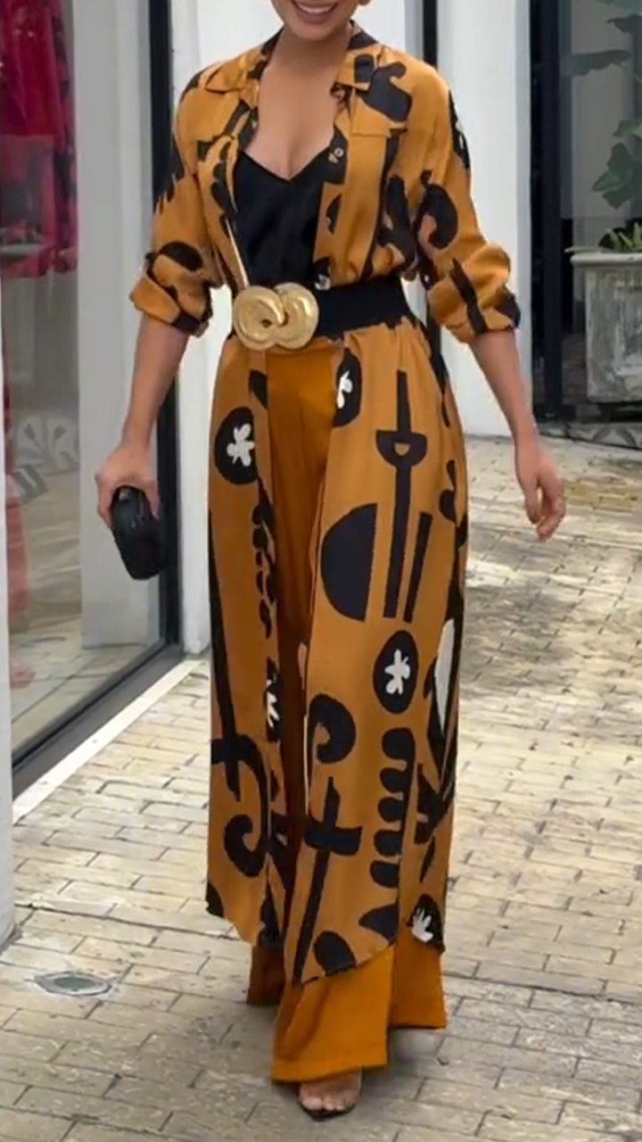Women's Collar Long Cardigan Printed Top+ Pants Casual Temperament Set