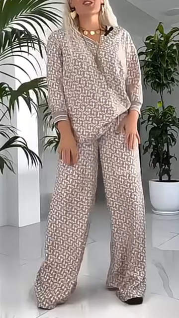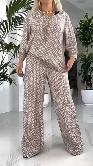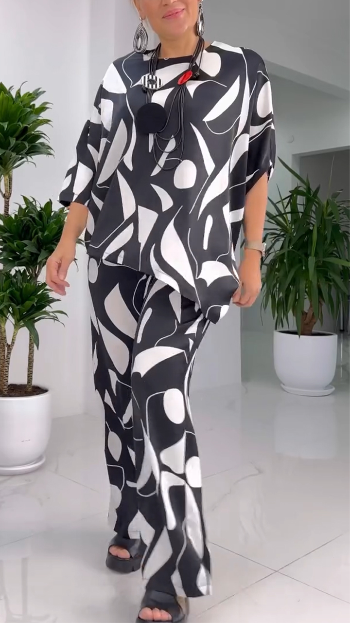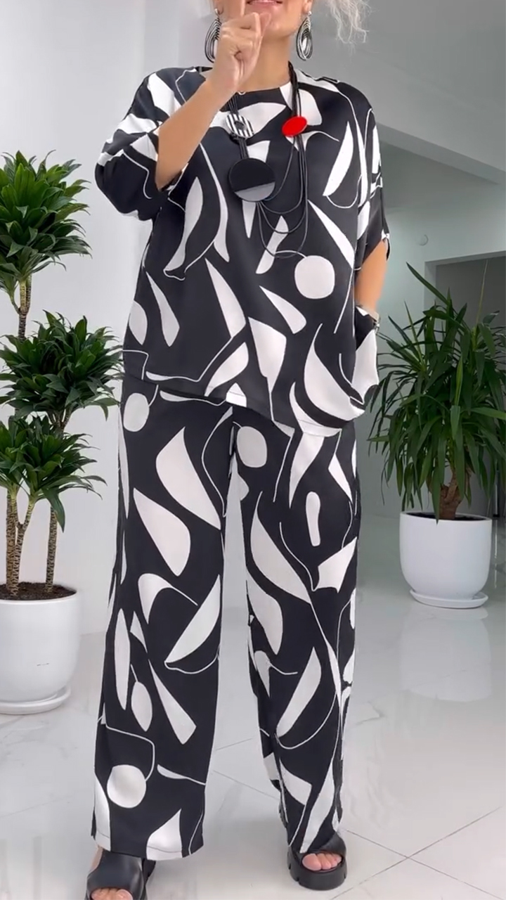 Ladies' Round Neck Solid Color Top+ Patterned Printed Pants Casual Set