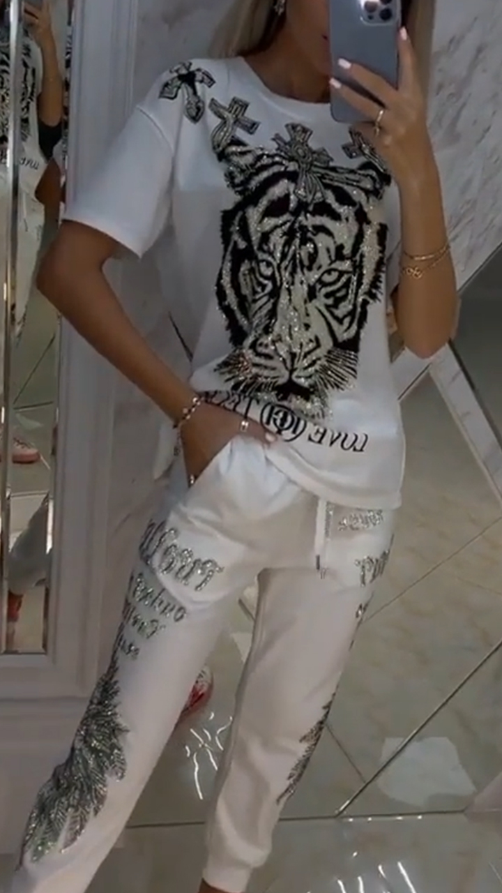 Ladies' Round Neck Printed Tiger Hot Stamping Top + Pants Casual Set