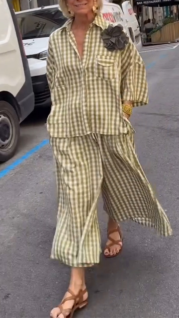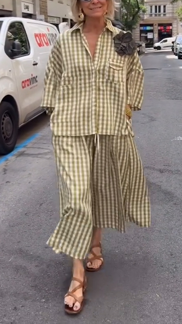 Ladies' Round Neck Solid Color Top+ Plaid Pants Casual Set