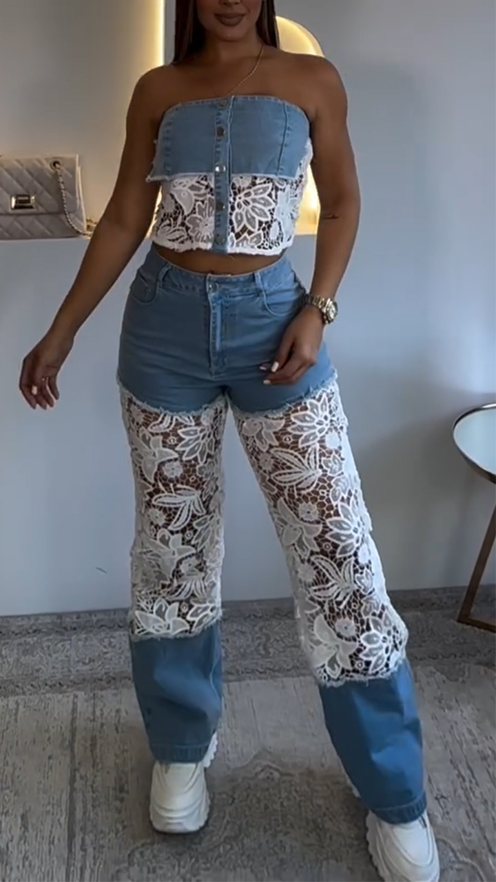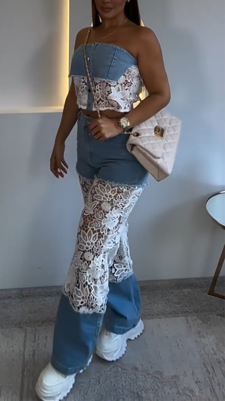 Ladies' Strapless Patchwork Printed Hollow Top+ Pants Casual Set