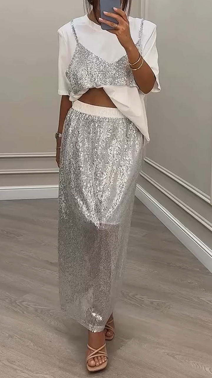 Ladies' Round Neck Patchwork Fake Two-piece Sequined Top+ Skirt Casual Set