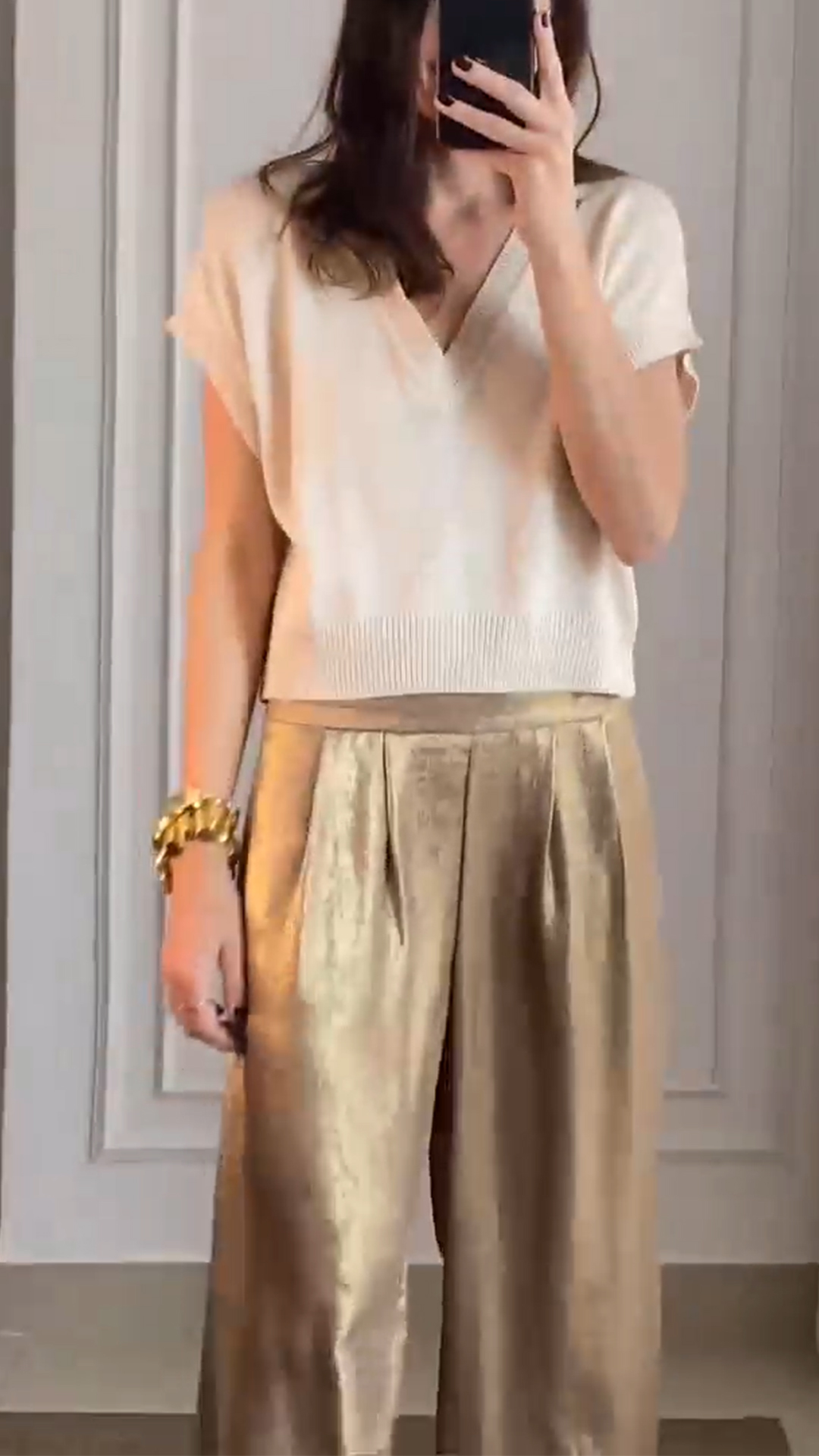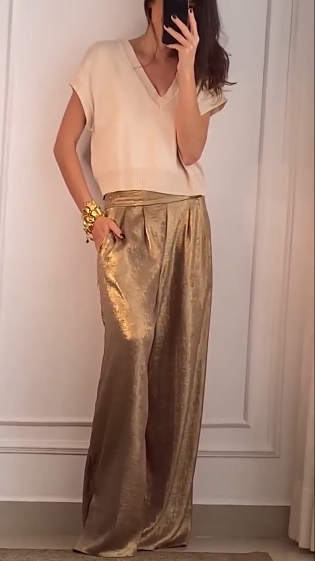 Ladies' Round Neck Side Pleated Top+ Pants Casual Set