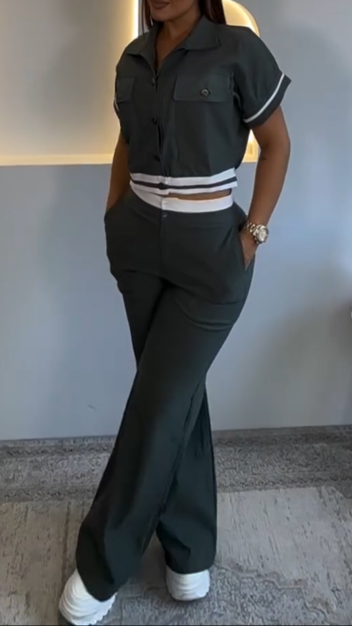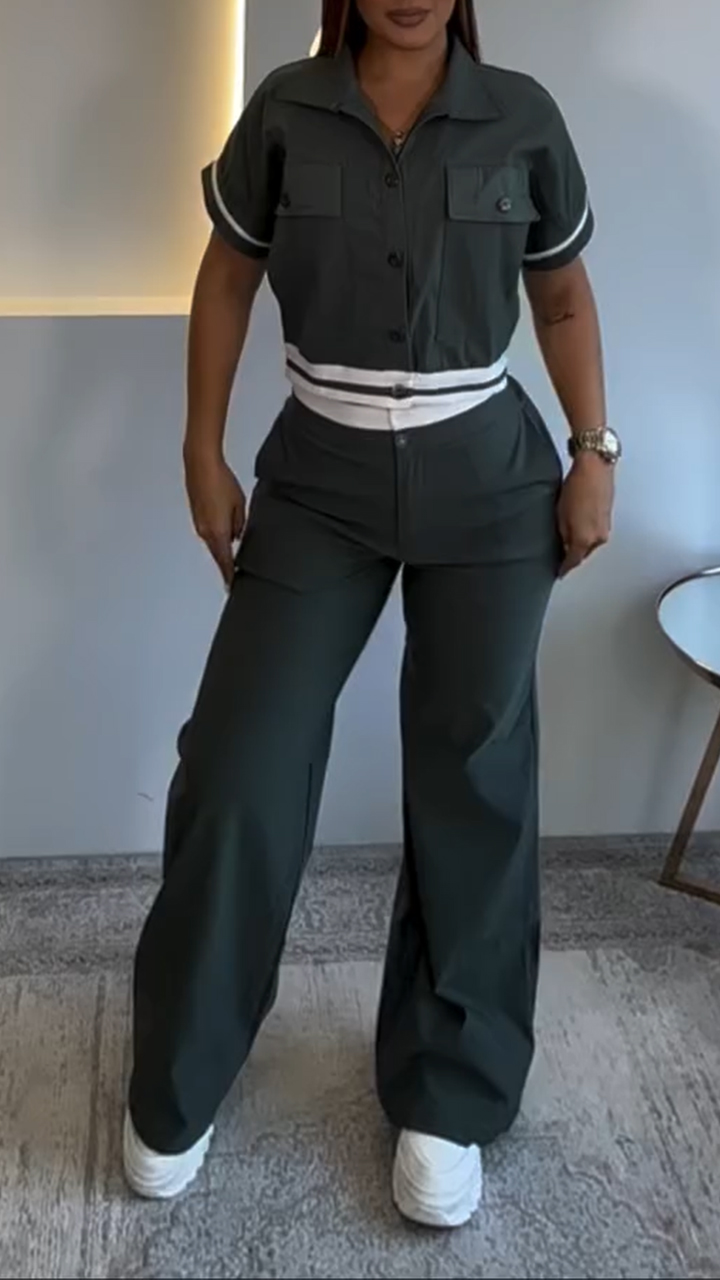 Ladies' One Piece Collar Splicing Top+ Pants Casual Set