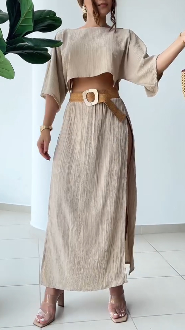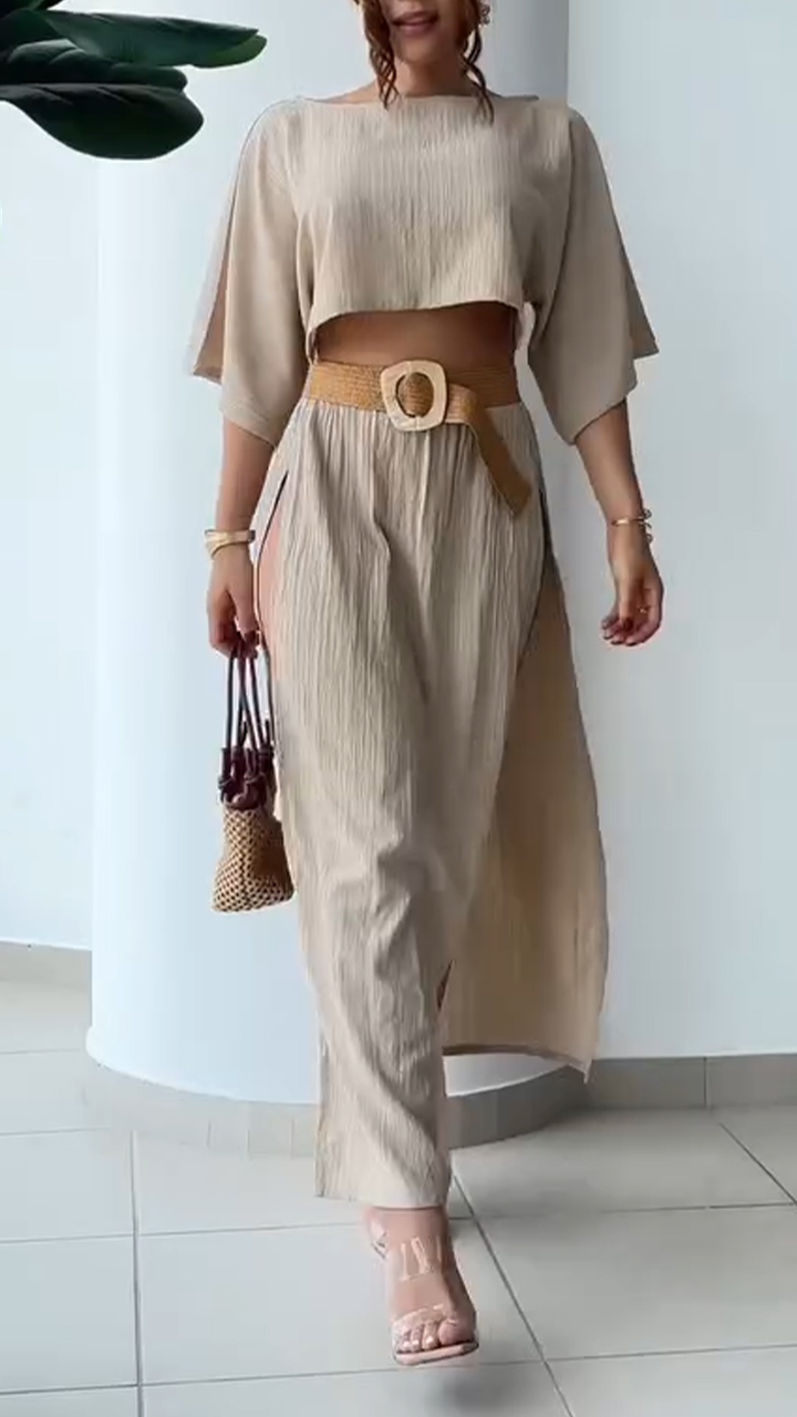 Ladies' Round Neck Solid Color Top+ Slit Skirt Casual Set