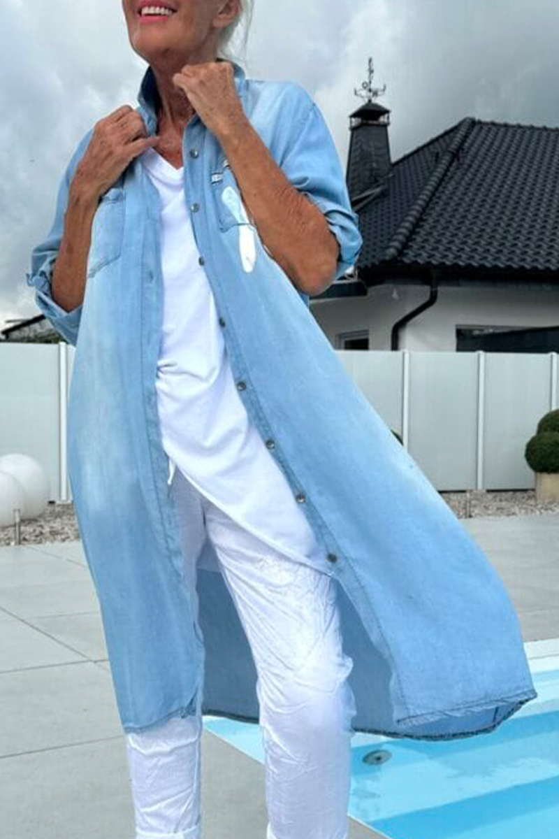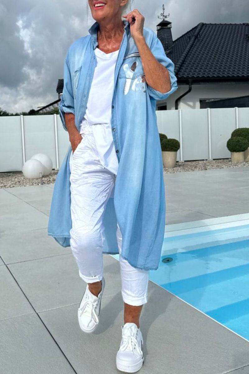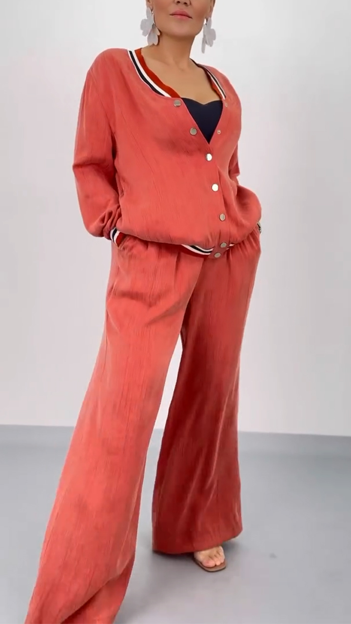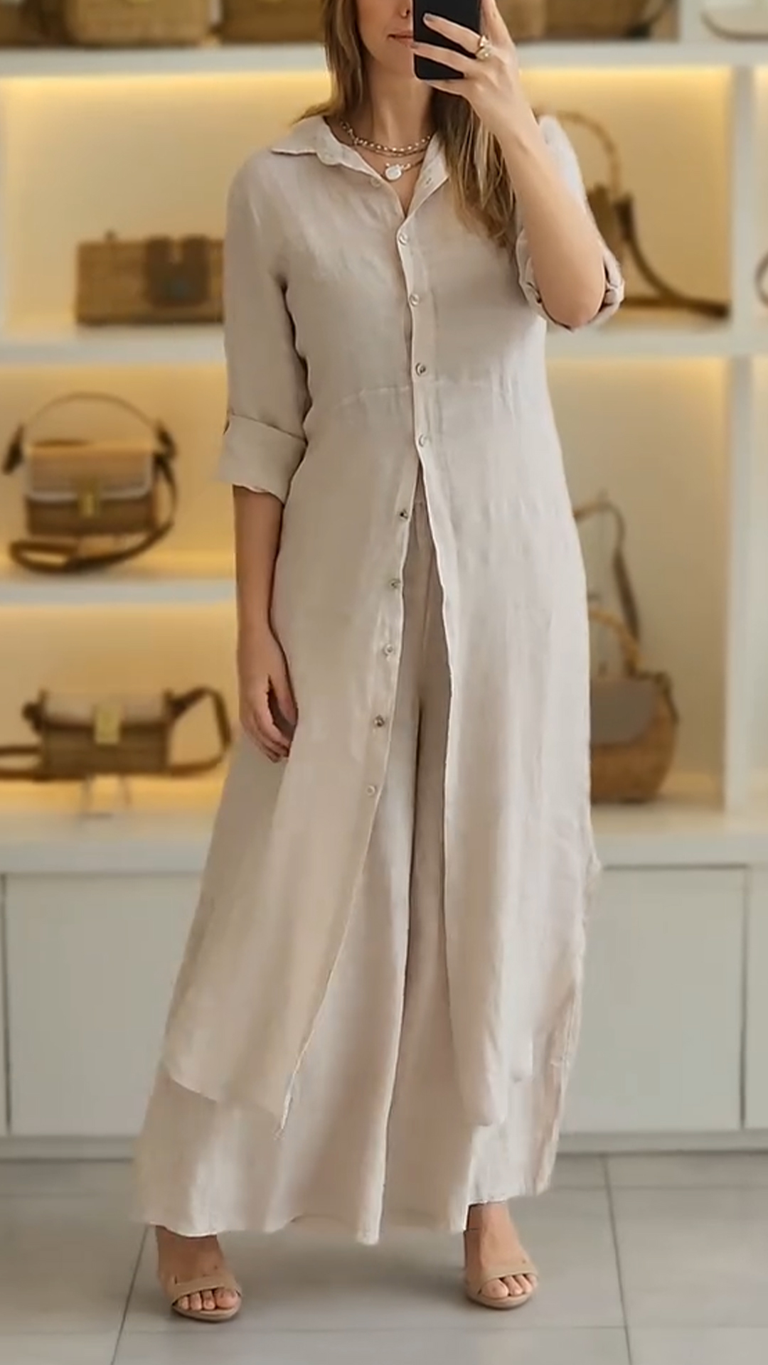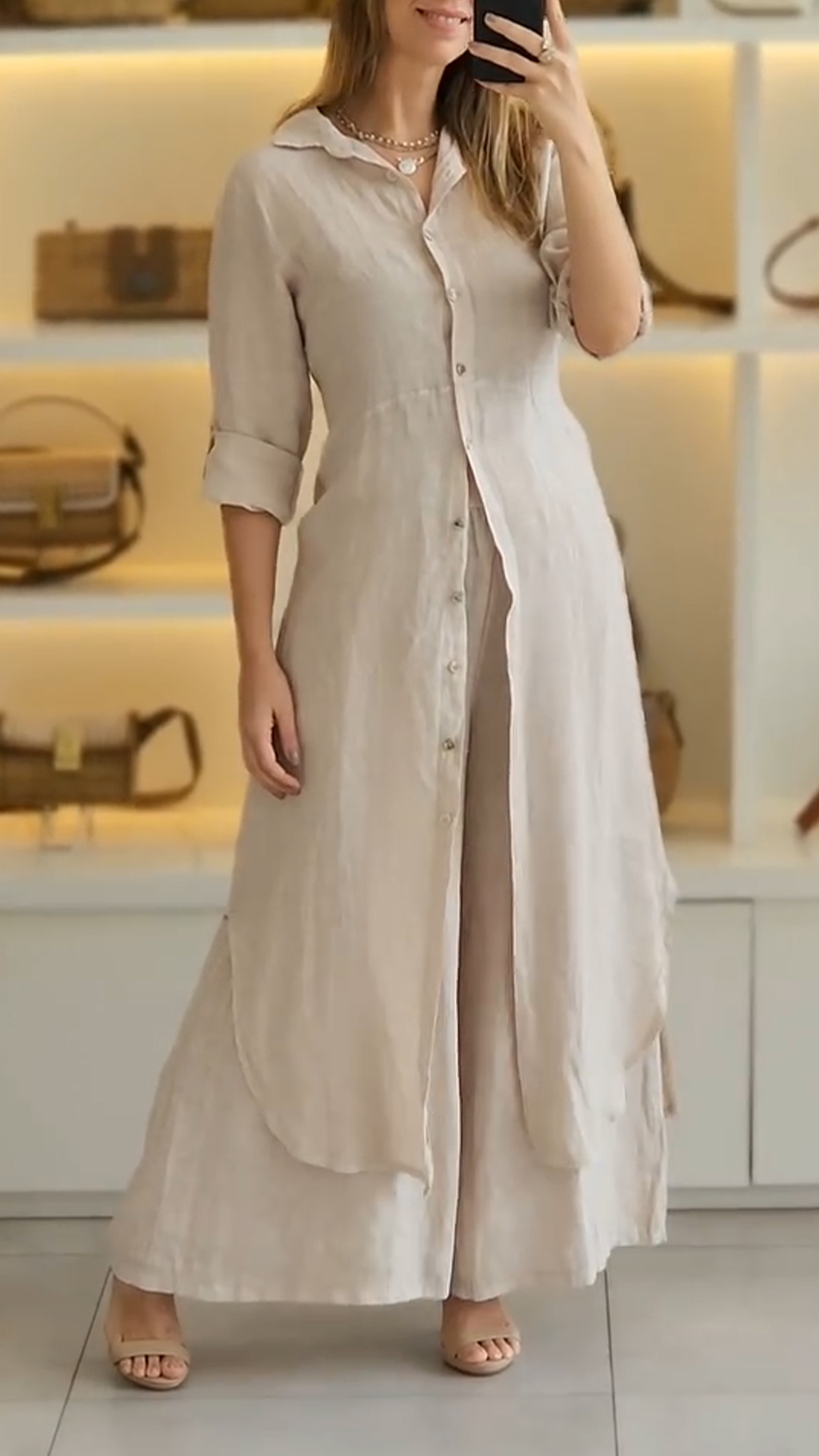 Women's Collar and Buckle Long Top+ Pants Loose Casual Suit