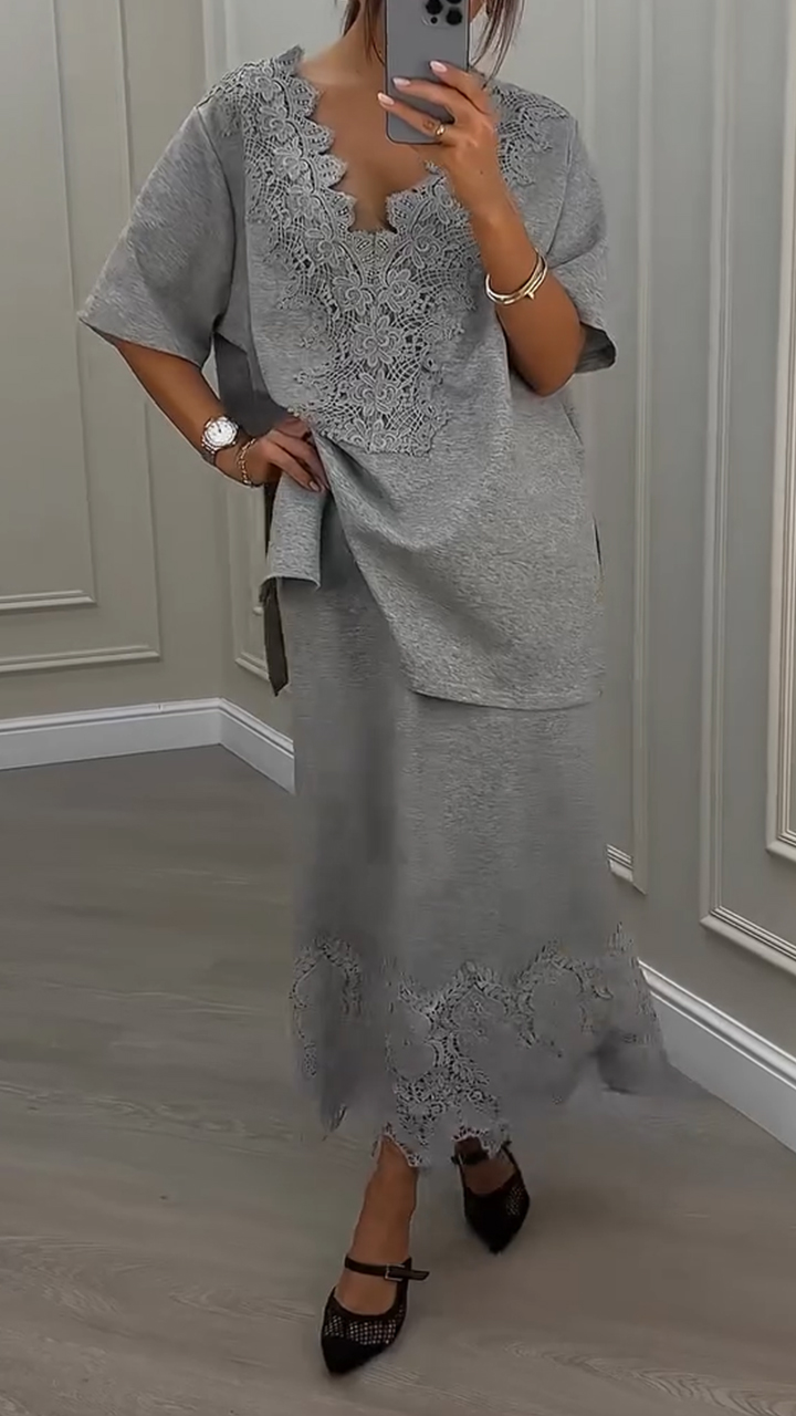 Ladies' Round Neck Solid Color Top+ Printed Hollow Skirt Casual Set
