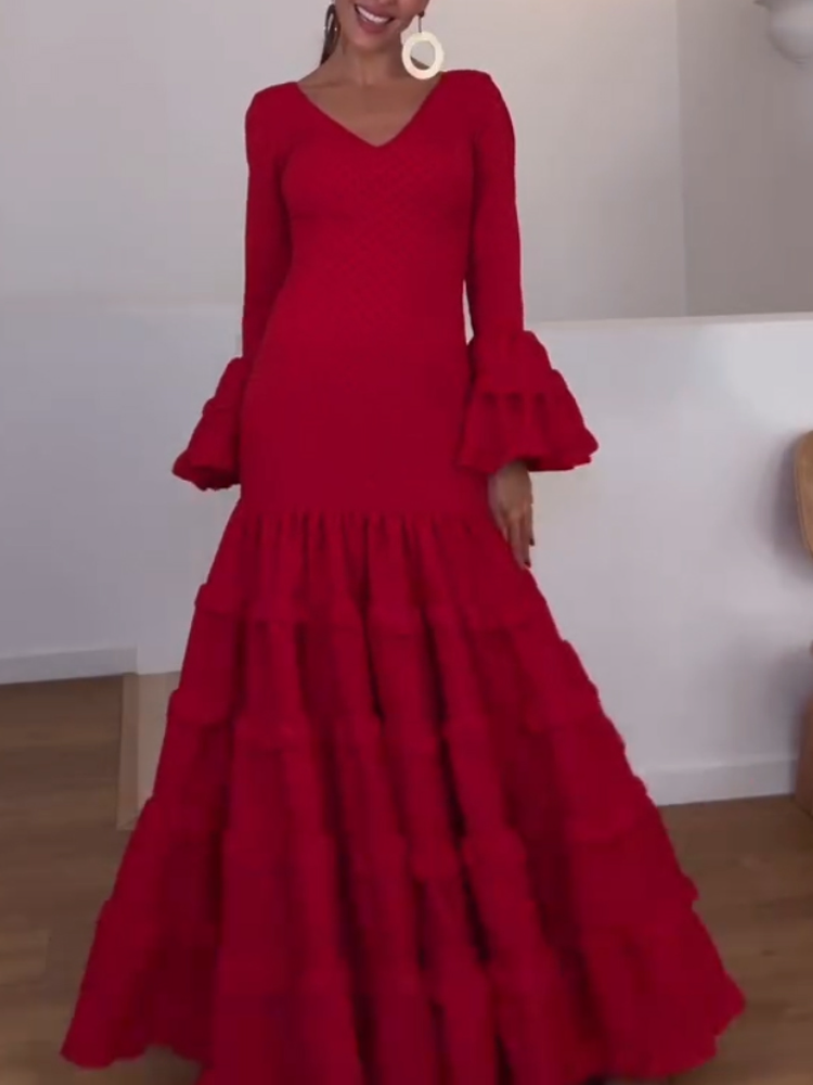 • Women's V-neck Trumpet Sleeve Multi-layer Fishtail Temperament Dress