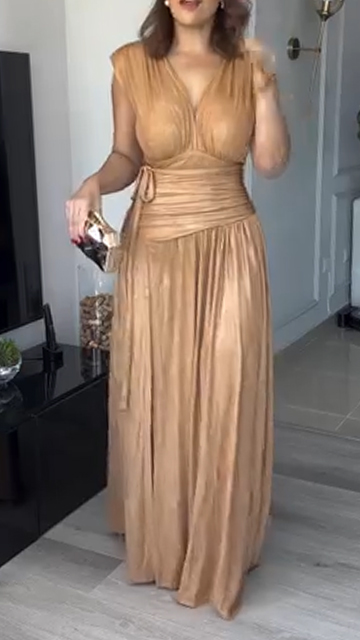 Ladies' V-neck Pleated Waist Cinching Elegant Dress