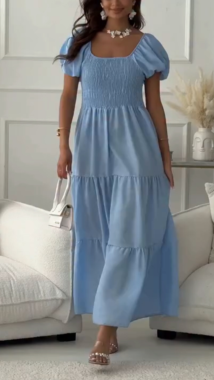 Ladies' Square Neck Pleated Patchwork Bubble Sleeve Casual Dress