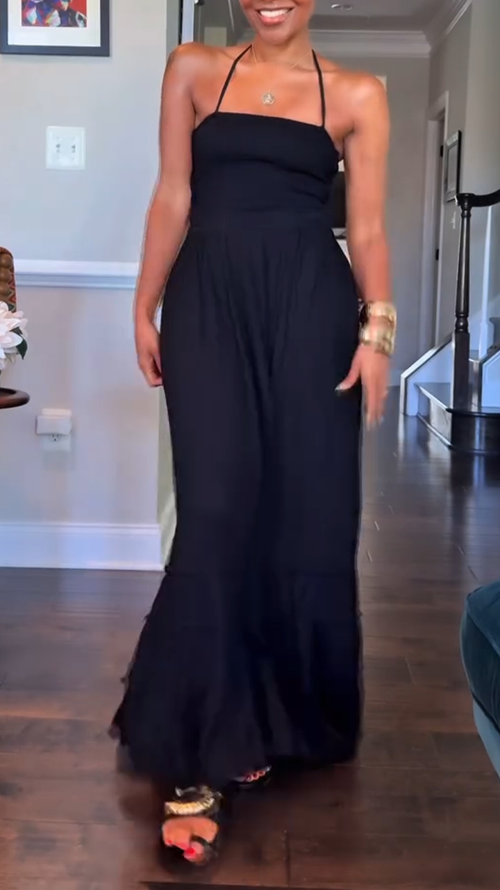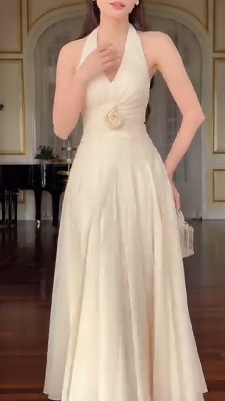 Ladies' V-neck Hanging Neck Solid Color Waist Cinching Elegant Dress