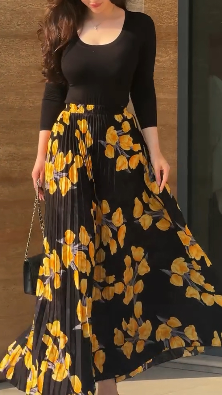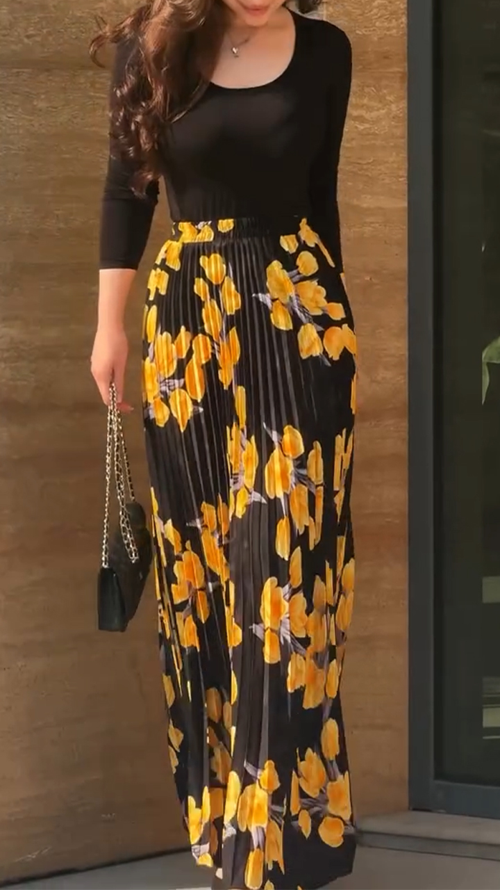 Ladies' Round Neck Patchwork Printed Pleated Elegant Dress