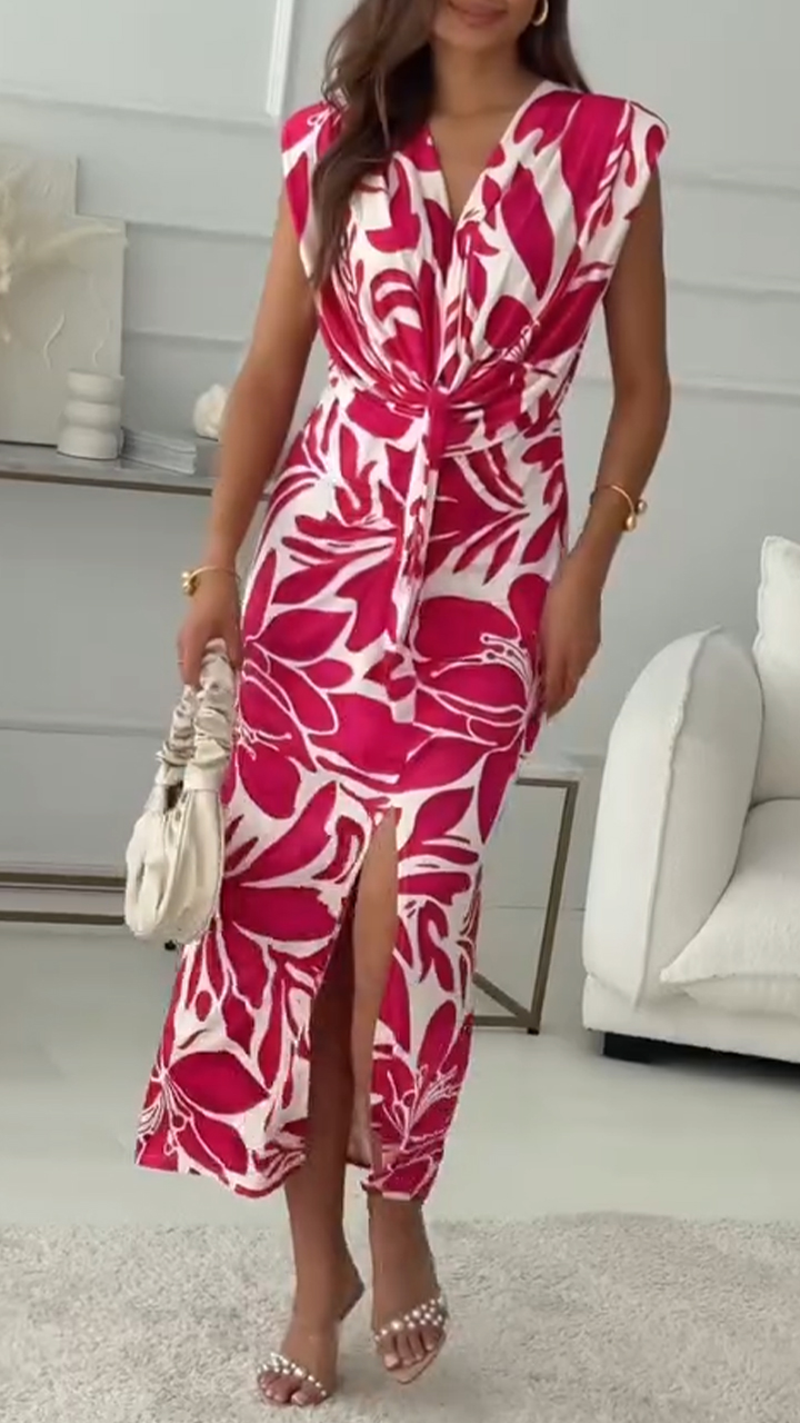 Ladies' Deep V-neck Printed Slit Slim Fit Dress