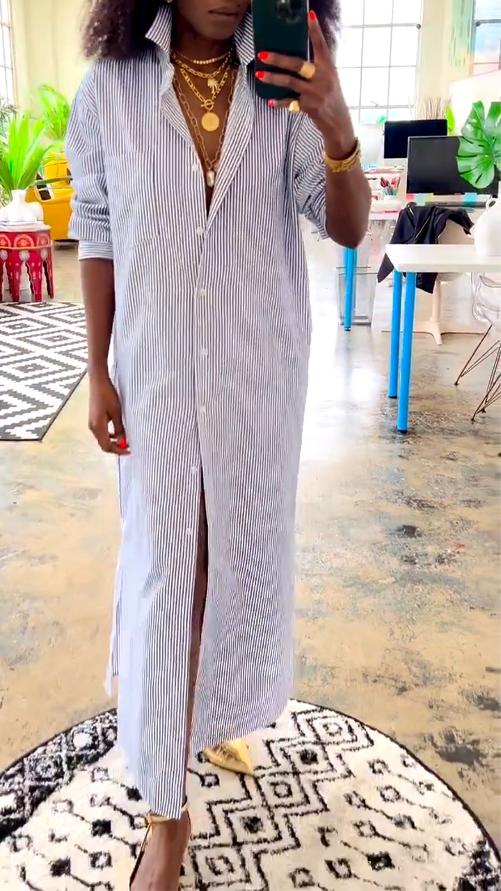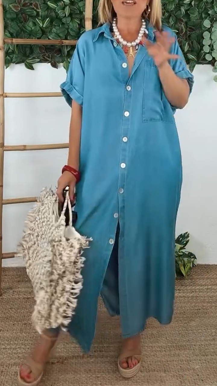 Ladies' Lapel Buckle and Slit Loose Casual Dress