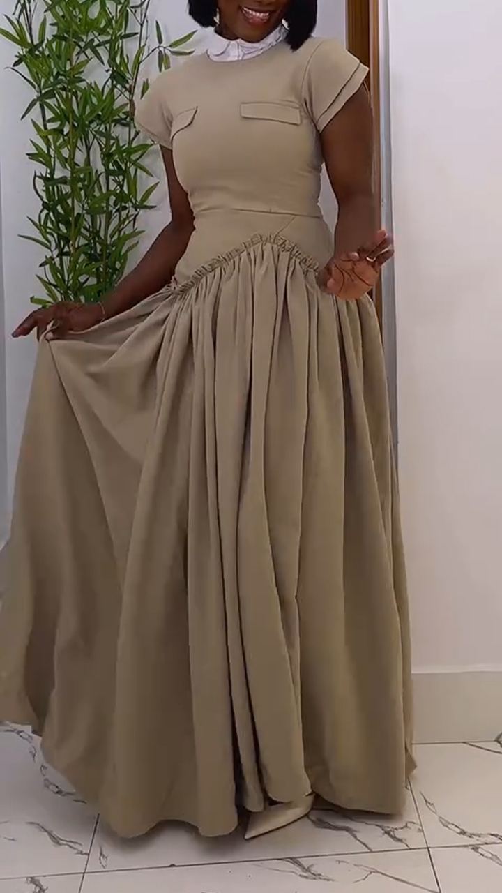 Ladies' Round Neck Breasted Solid Color Elegant Dress