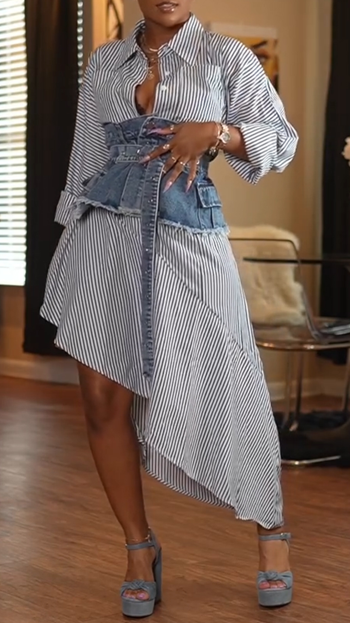 Women's Lapel Striped Irregular Dress + Denim Waist Belt Casual Suit