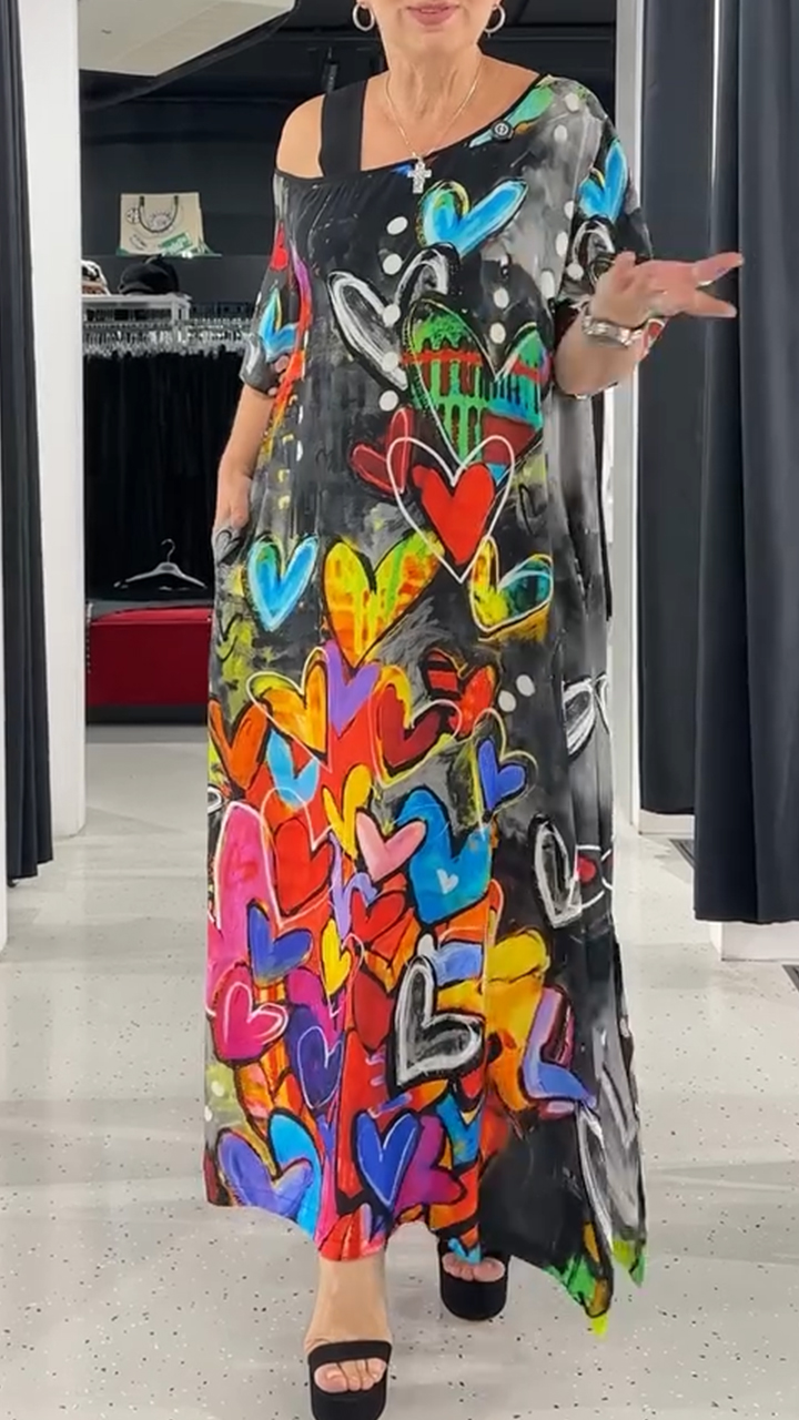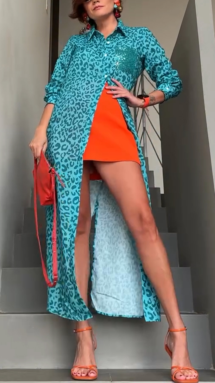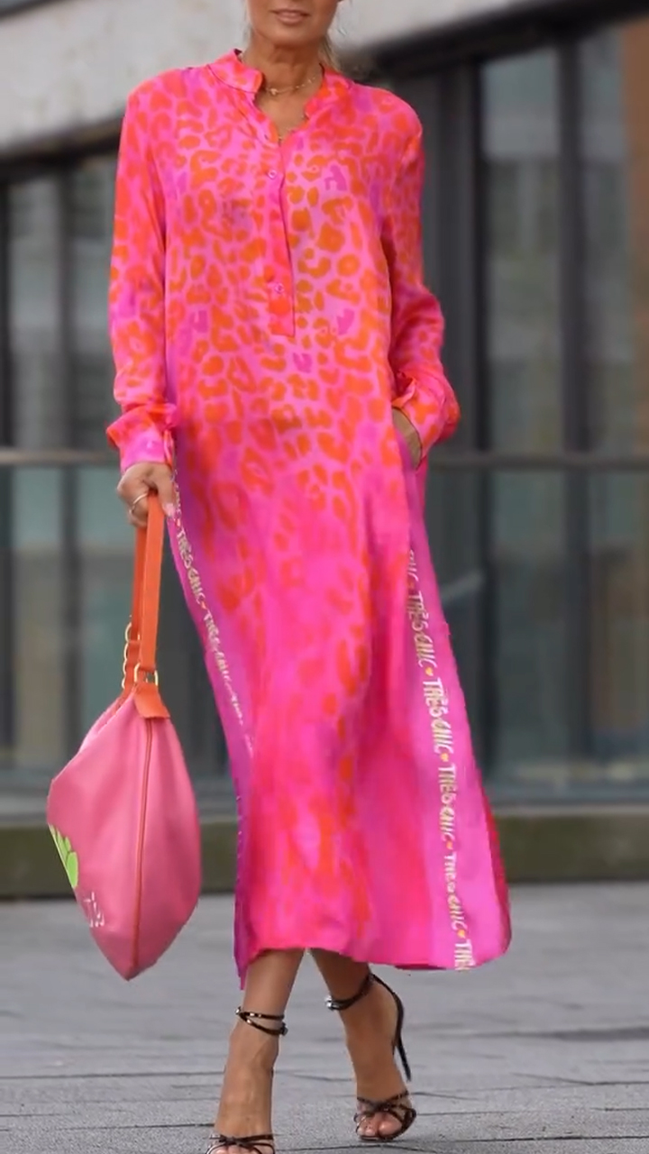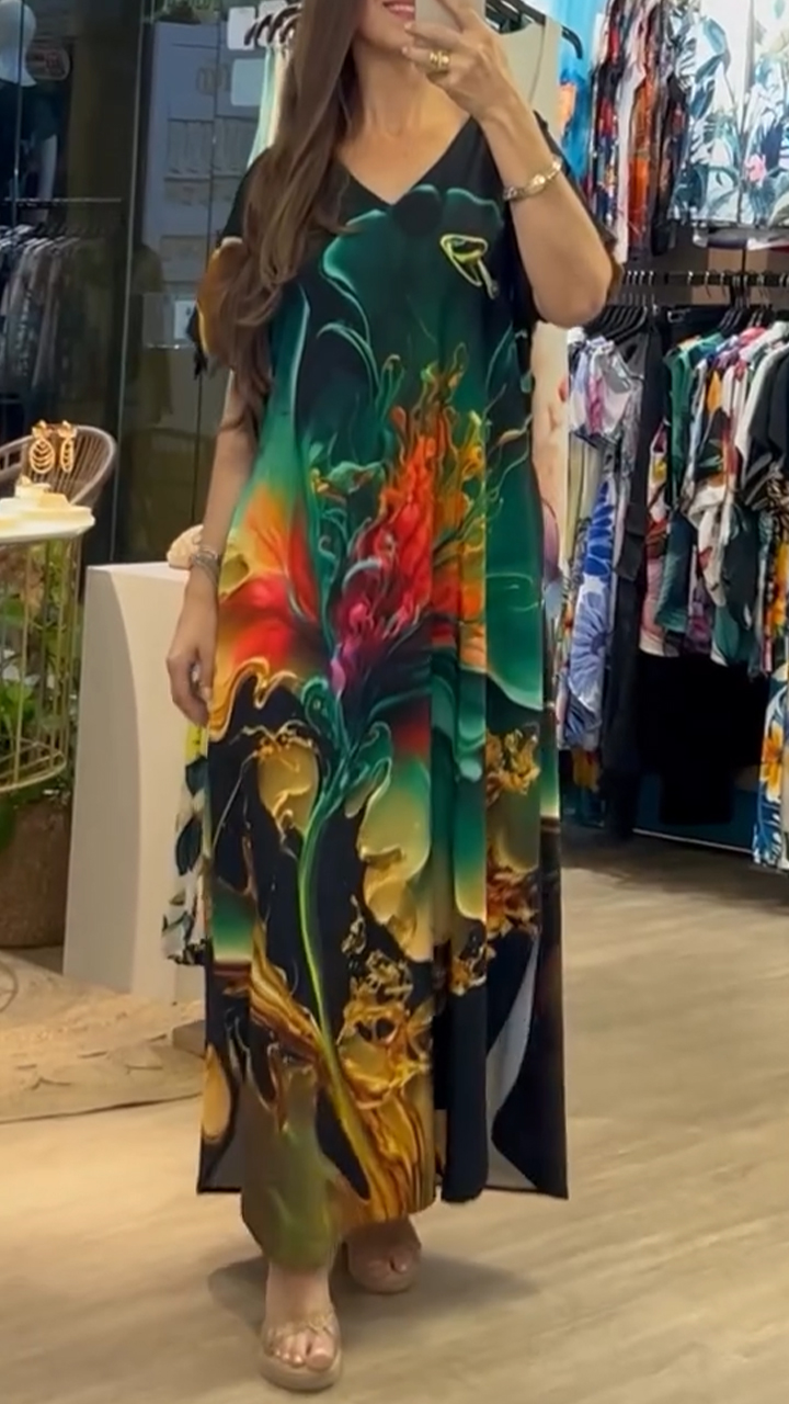 Ladies' V-neck Printed Silver Hot Stamping Slit Casual Dress