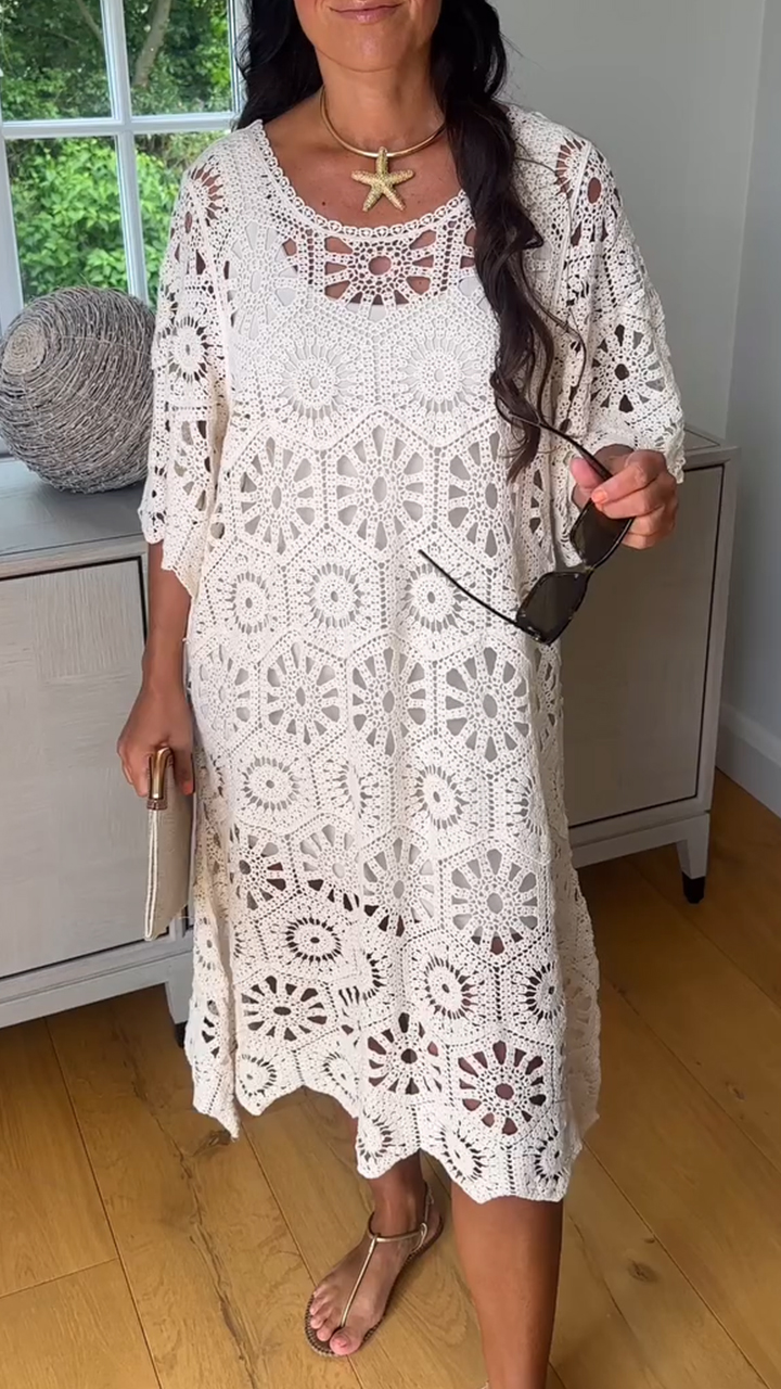 Ladies' Round Neck Hollow Out Solid Color Casual Dress