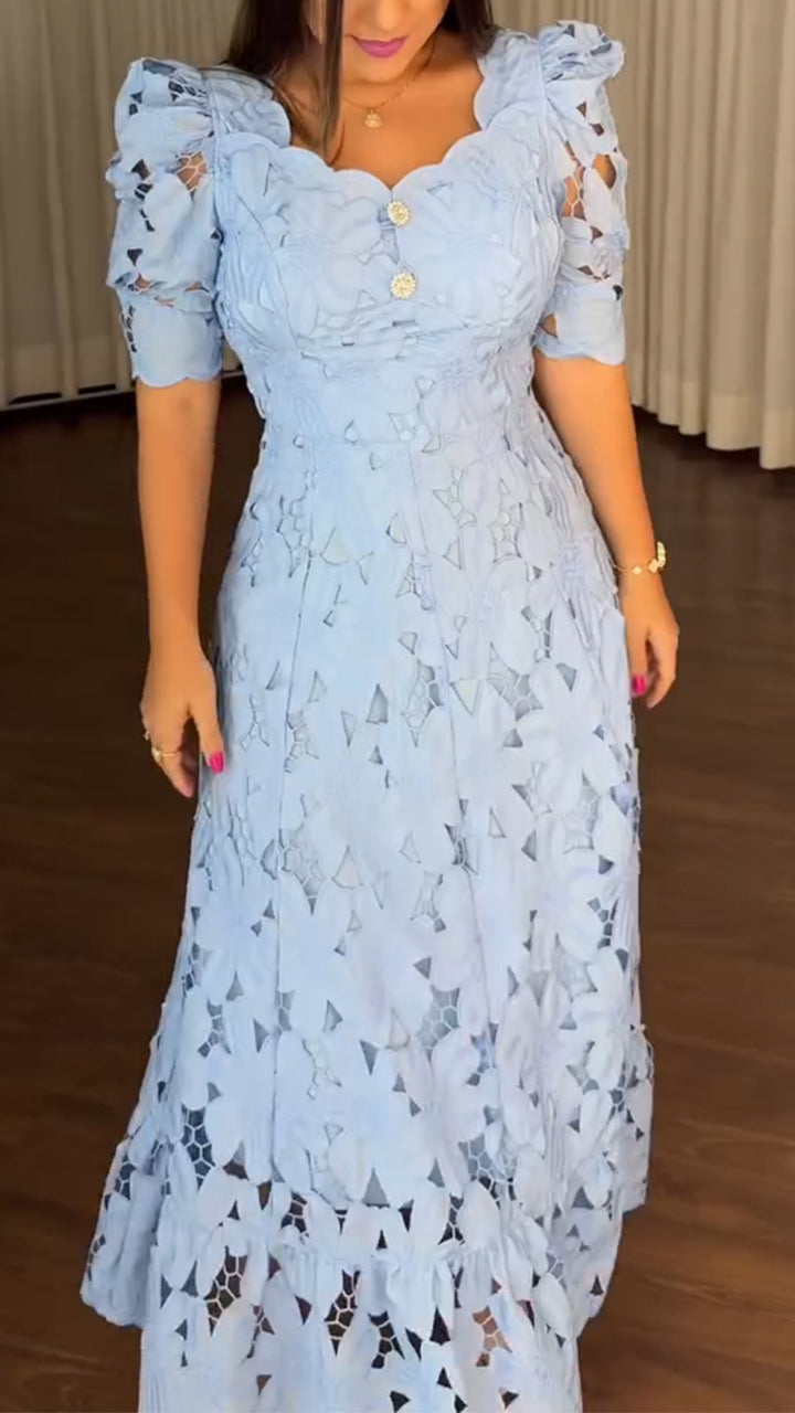 Women Round neck short sleeve embroidered hollow cotton and linen dress