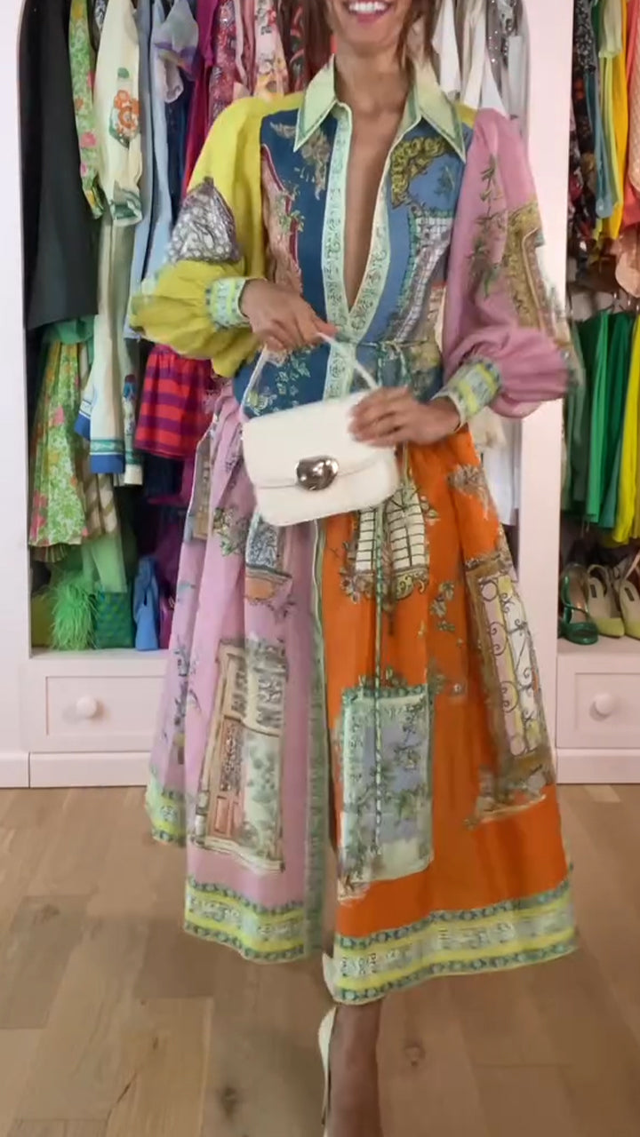 Women's V-neck Waist-tied Back Tie-up Elegant A-line Printed Dress