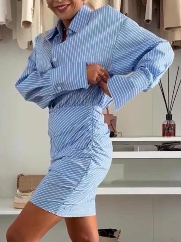 Women's Lapel Long Sleeve Striped Stitching Temperament Dress