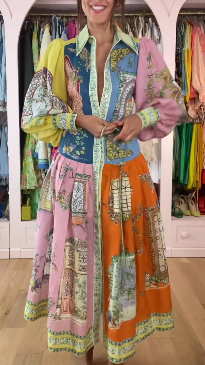 Women Vintage Ethnic Print Loose Long-sleeved Cotton Linen Dress