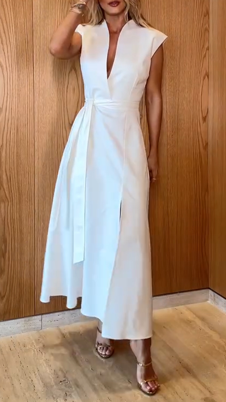 Ladies' Round Neck Waist Pleated Slit Temperament Casual Dress