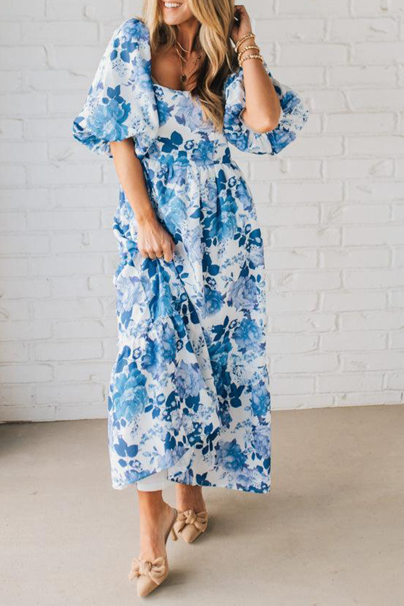 Ladies' Square Neck Printed Bubble Sleeve Casual Dress