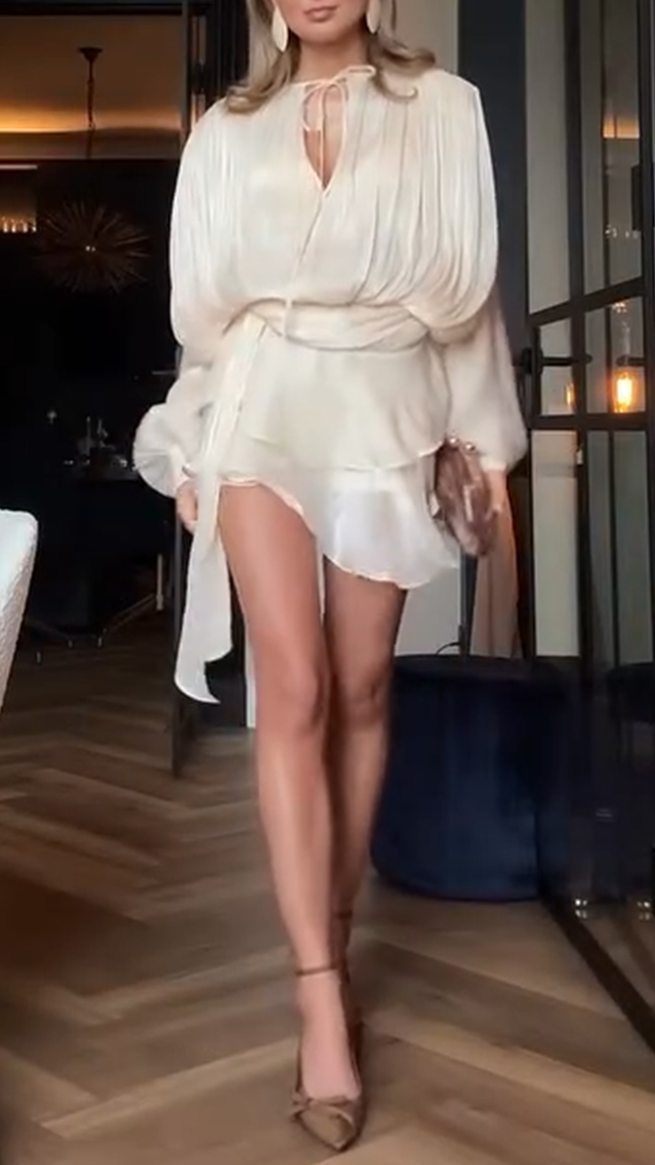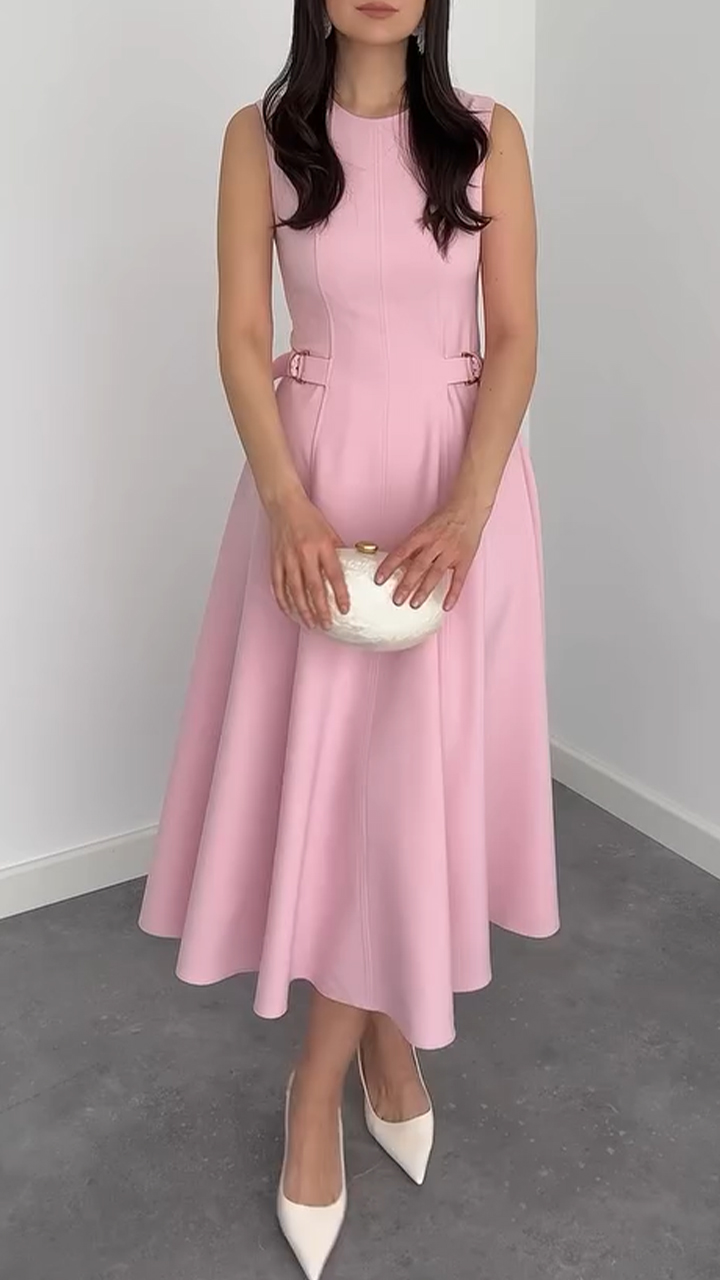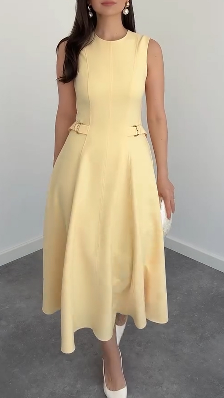 Ladies' Round Neck Buckle Design with Slit Hem Casual Dress