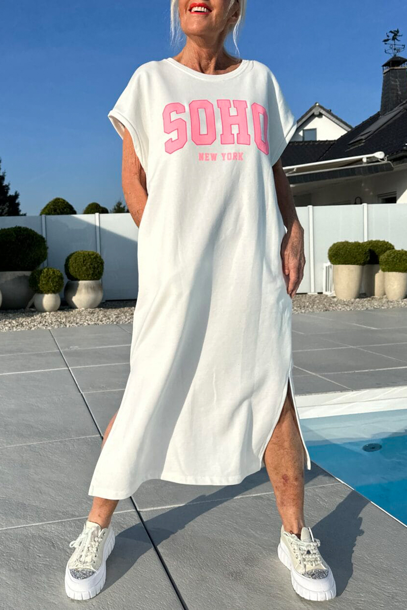 Ladies' Round Neck Letter Printed Side Slit Loose Casual Dress