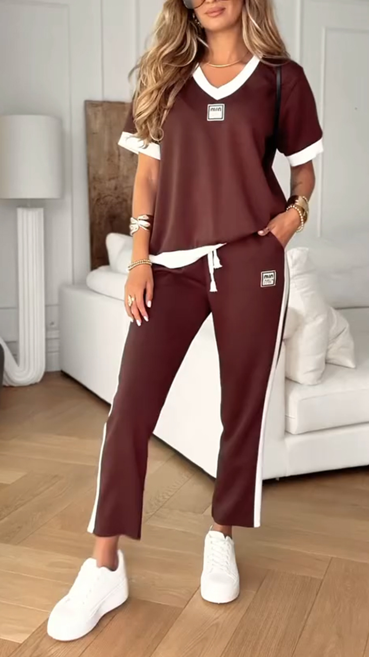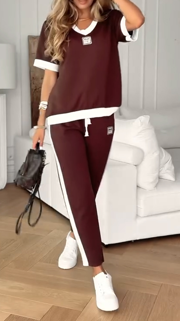 Ladies' V-neck Patchwork Top+ Pants Casual Suit