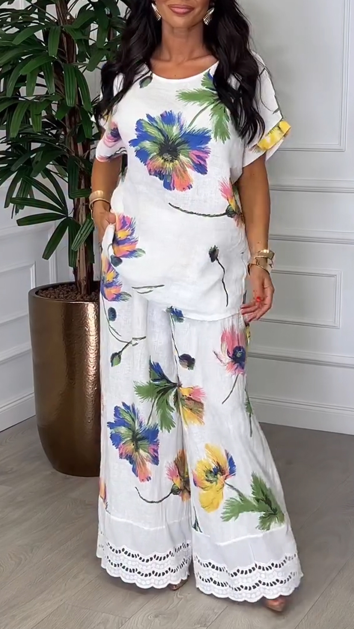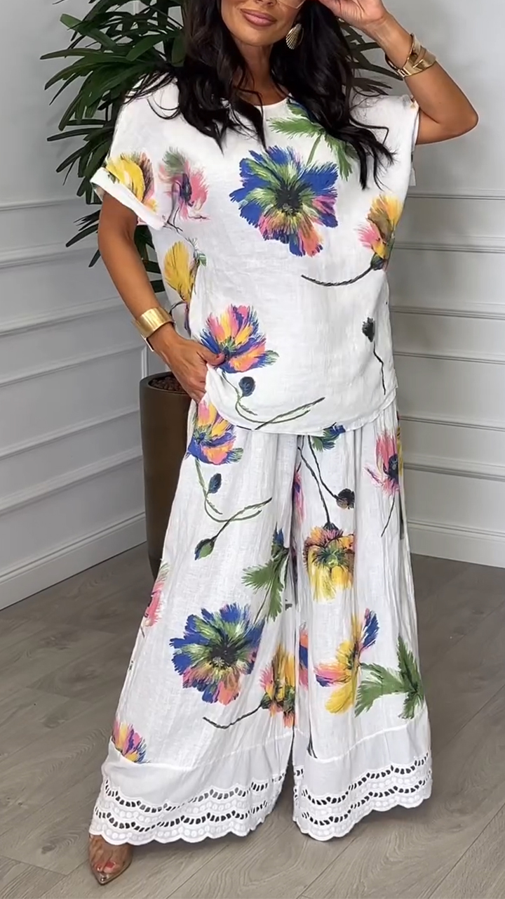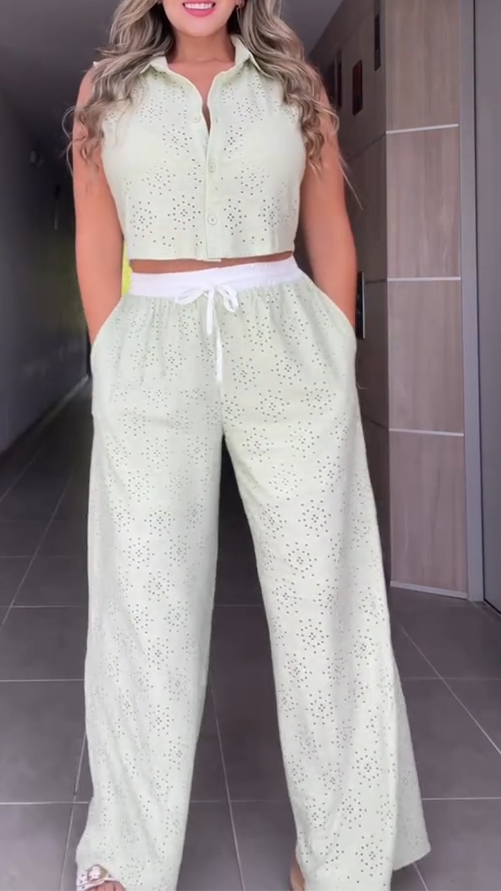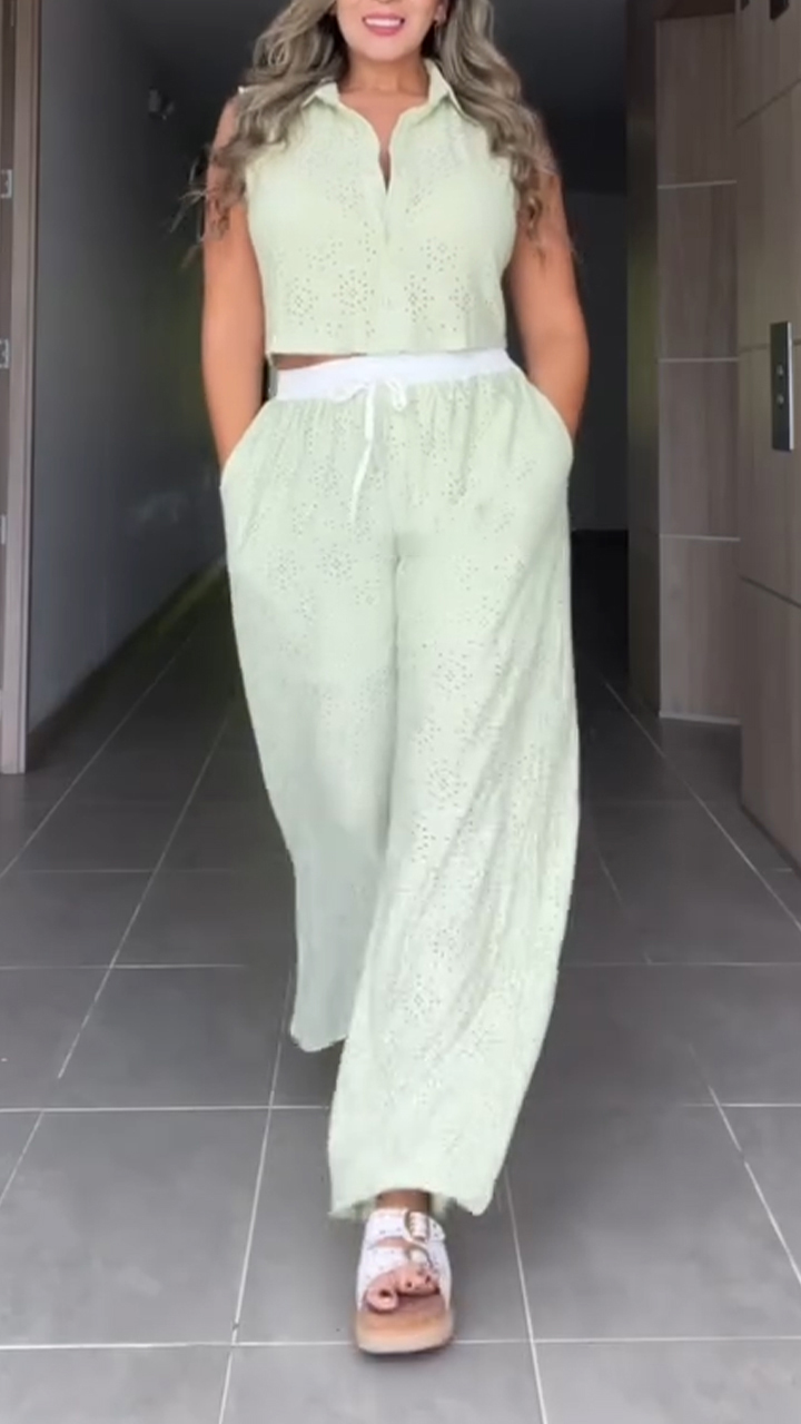Ladies' Collar Printed Hollow Top+ Pants Casual Set