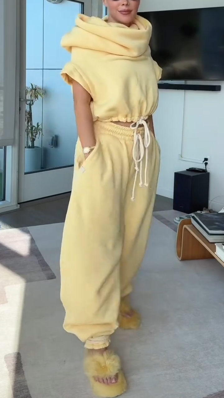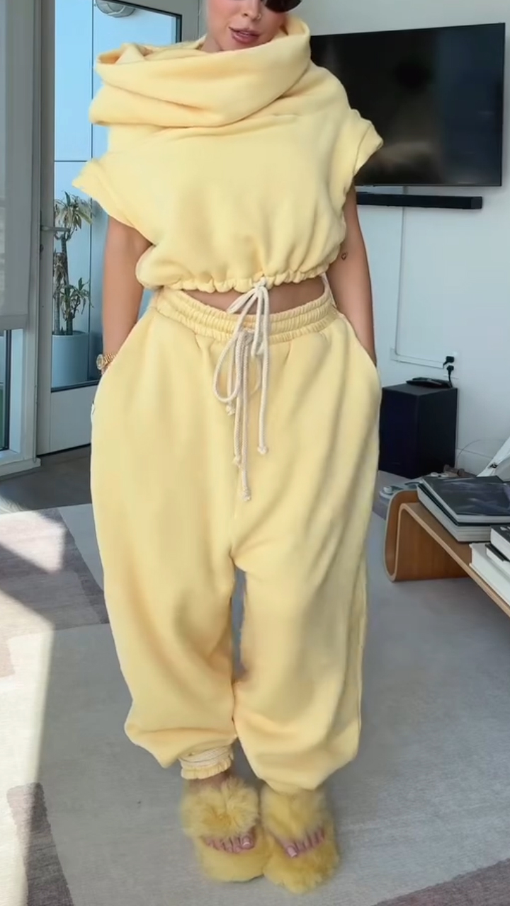 Ladies' High Neck Scarf Solid Color Top+ Pants Casual Set