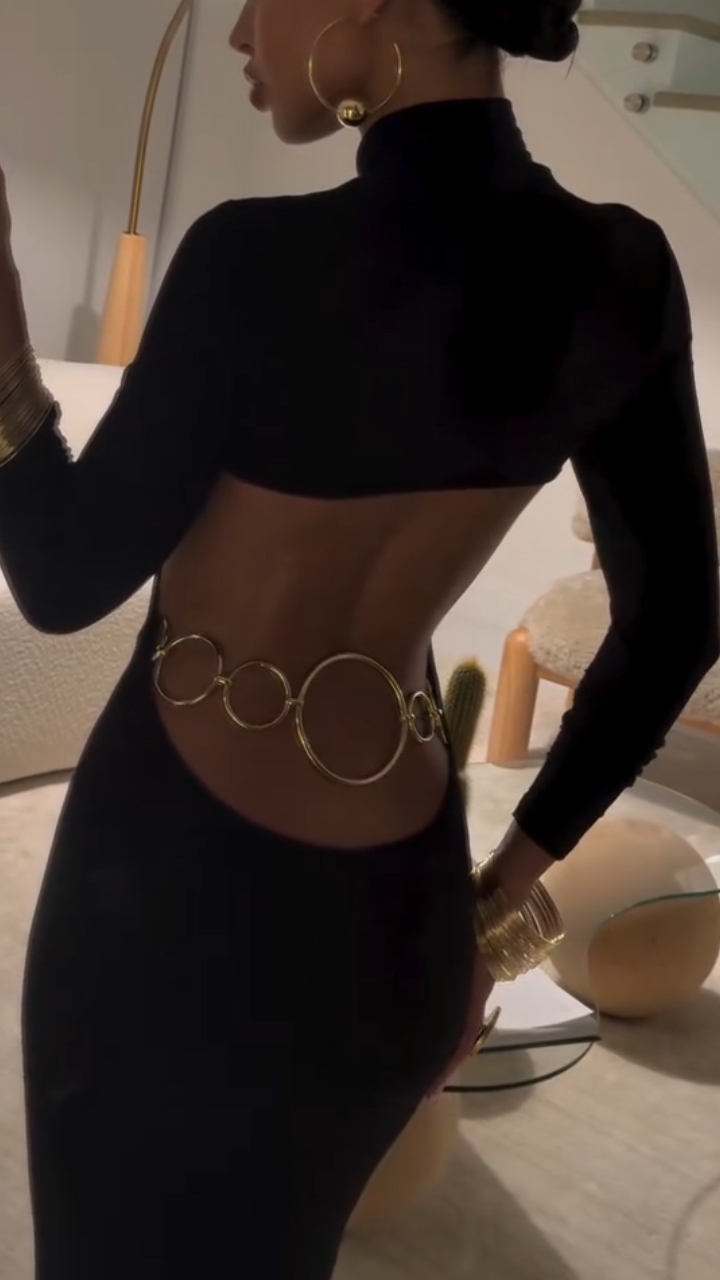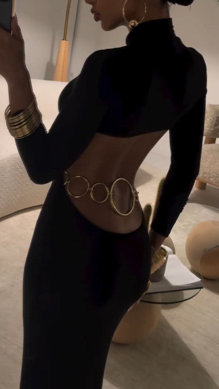 Ladies' High Neck Hollow Ring Buckle Temperament Slim Fit Dress