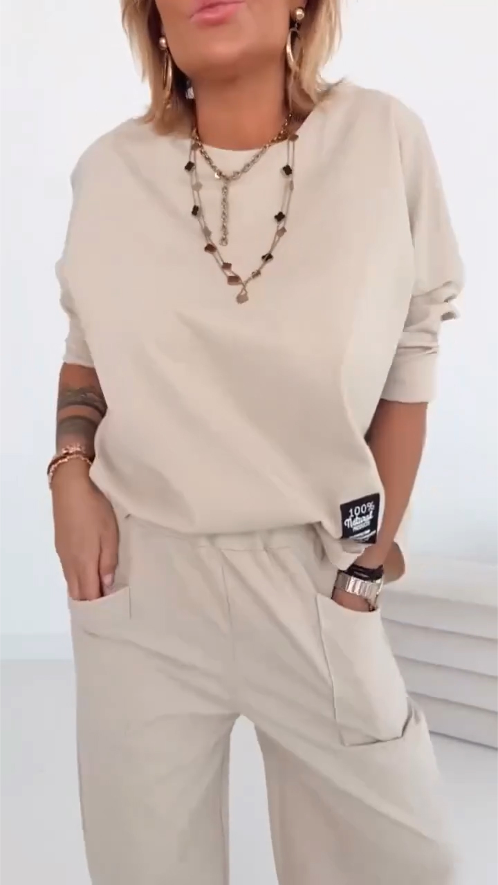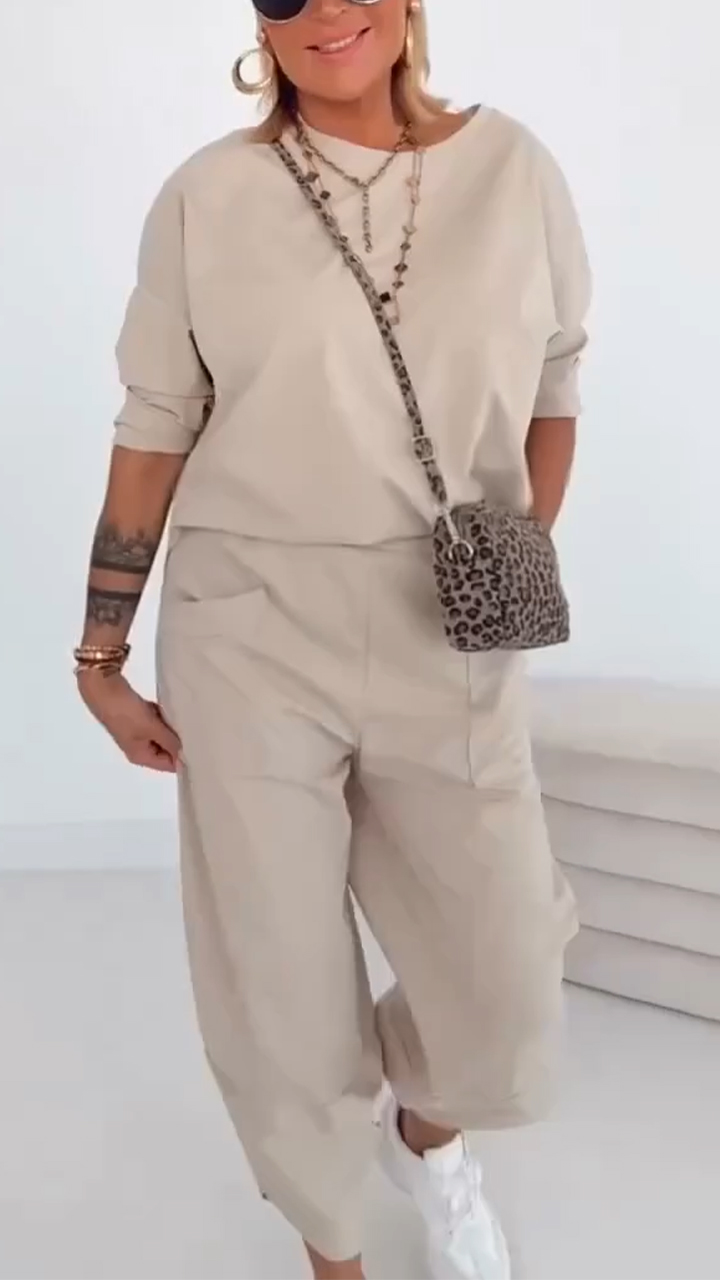 Ladies' Round Neck Solid Color Top+ Pants Casual Set